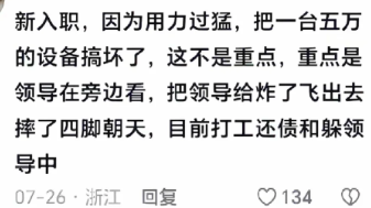 新入职,因为用力过猛,把一台五万的设备搞坏了,这不是重点,重点是领导在旁边看,把领导给炸了飞出去摔了四脚朝天,目前打工还债和躲领导中