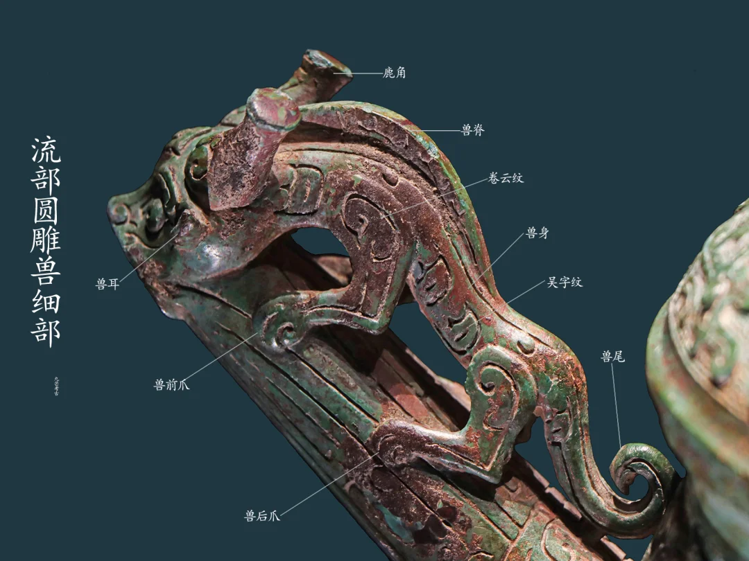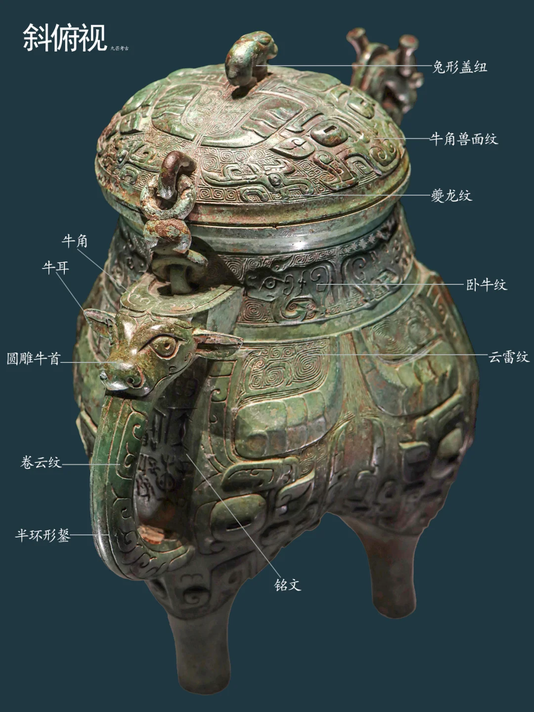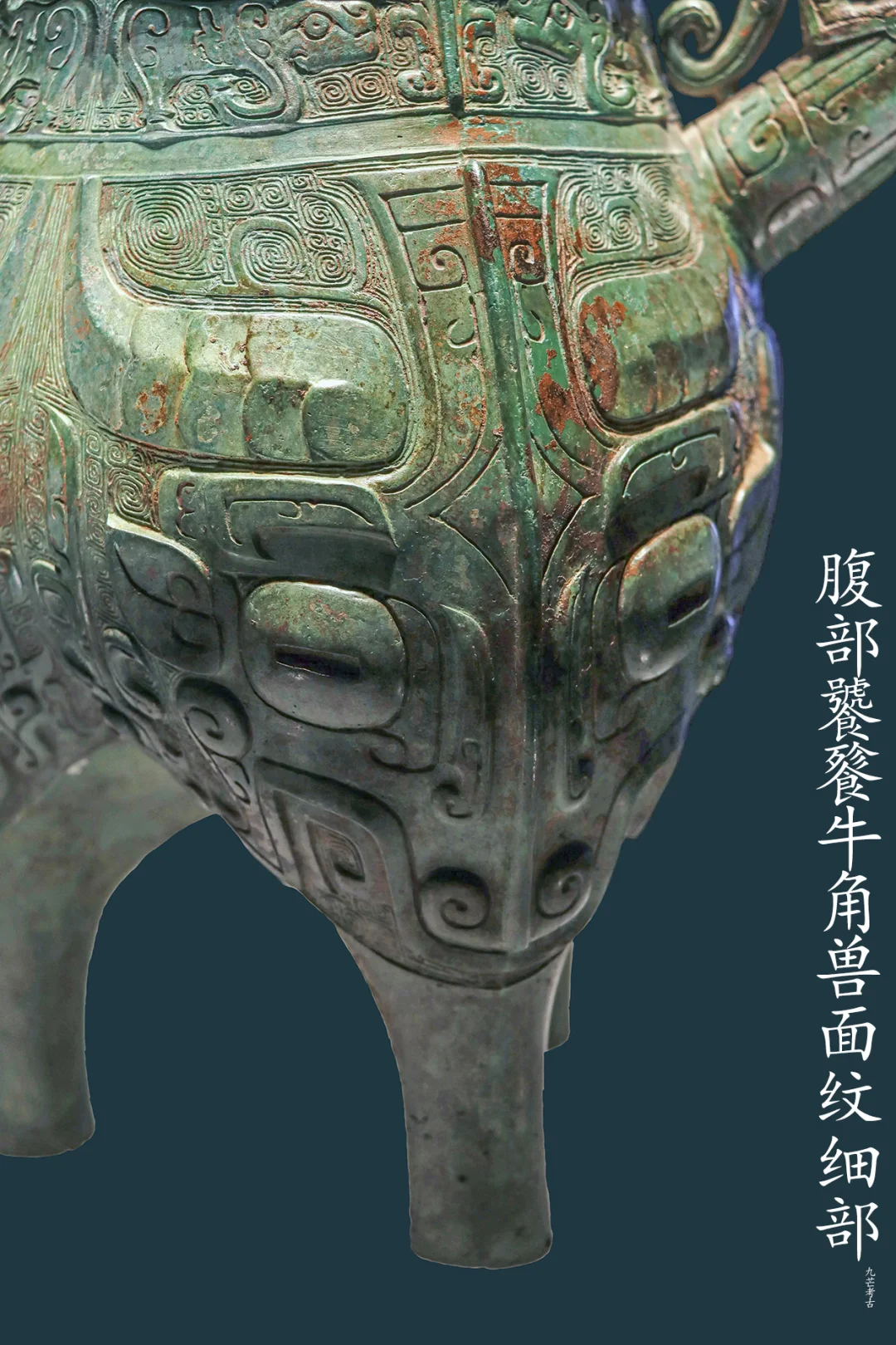 纹饰:除三素面足外,其余器表均施以精美的三重满花纹饰,造型及其生动。盖纽上兔、流上攀爬的菌状角龙均采用圆雕的手法,个体写实、逼真,立体感强。器盖面有一周凸弦纹,主体纹饰以一条凸弦纹为中线,作两组左右分布。每组以云雷纹为地,浅浮雕一牛角兽面纹和两条夔龙纹。鋬部纹饰采用圆雕、浅浮雕及阴铸相结合,饰以牛的正面形象,立面感强。流体表面通体施纹饰,近腹部内端环绕状分布的两条凹弦纹和卷云纹,外端一周饰倒三角纹(变体蝉纹),上、下、作、右各一,顶角均朝流口,内填以简化的变形动物躯干、足爪和小三角纹。器颈部和腹部纹饰繁缛、精美,中以一周素面宽带隔开。颈部以两周凸弦纹为栏,填以云雷纹为地,内饰浅浮雕牛角兽面纹和卧牛纹。腹部纹饰上、下各有一周凸弦纹作界,内填以云雷纹为地,浅浮雕三组牛角兽面纹和夔龙纹。