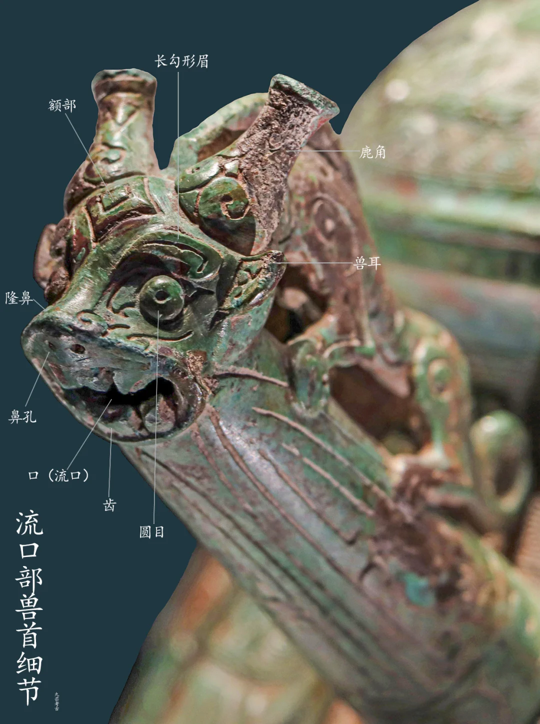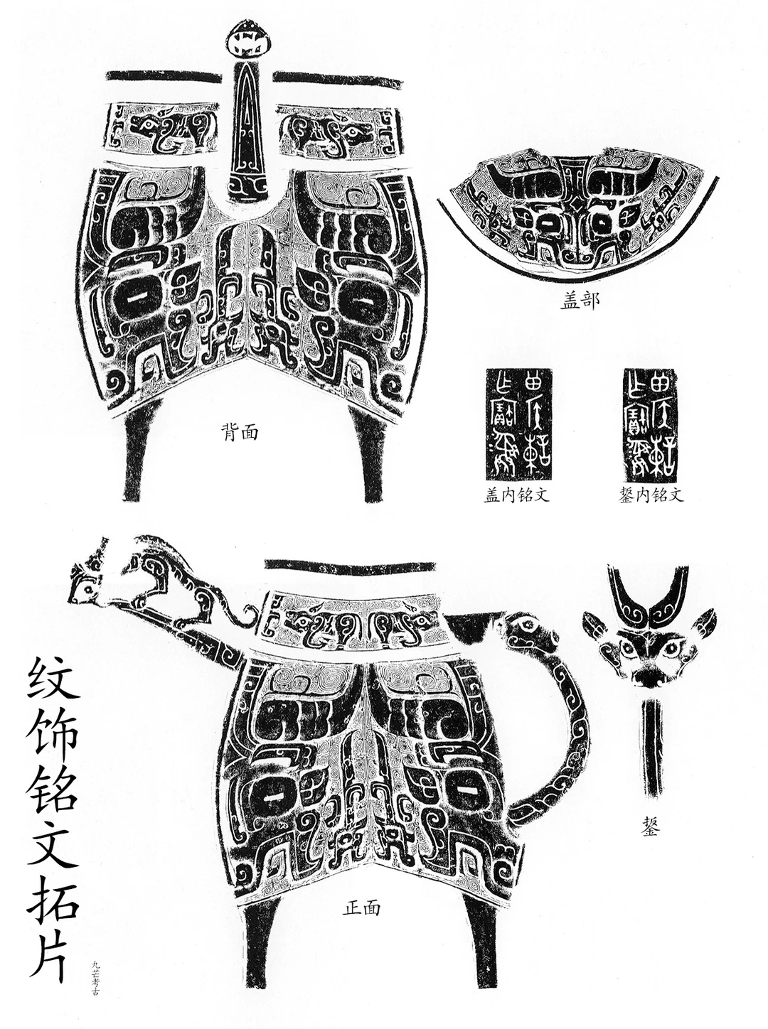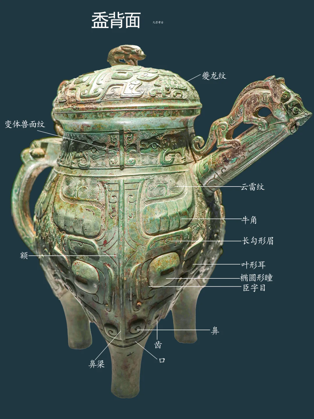 纹饰:除三素面足外,其余器表均施以精美的三重满花纹饰,造型及其生动。盖纽上兔、流上攀爬的菌状角龙均采用圆雕的手法,个体写实、逼真,立体感强。器盖面有一周凸弦纹,主体纹饰以一条凸弦纹为中线,作两组左右分布。每组以云雷纹为地,浅浮雕一牛角兽面纹和两条夔龙纹。鋬部纹饰采用圆雕、浅浮雕及阴铸相结合,饰以牛的正面形象,立面感强。流体表面通体施纹饰,近腹部内端环绕状分布的两条凹弦纹和卷云纹,外端一周饰倒三角纹(变体蝉纹),上、下、作、右各一,顶角均朝流口,内填以简化的变形动物躯干、足爪和小三角纹。器颈部和腹部纹饰繁缛、精美,中以一周素面宽带隔开。颈部以两周凸弦纹为栏,填以云雷纹为地,内饰浅浮雕牛角兽面纹和卧牛纹。腹部纹饰上、下各有一周凸弦纹作界,内填以云雷纹为地,浅浮雕三组牛角兽面纹和夔龙纹。