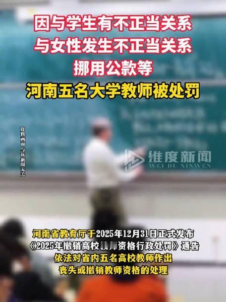 触目惊心!河南5名高校教师被撤销资格,2人与学生有不正当关系,校方回应引众怒 老师本该是“行为世范”的榜样,可河南这5名高校教师却跌破底线!近日省教育厅的一则通报炸翻全网:5人被依法撤销或丧失教师资格,其中2人竟与学生发生不正当关系,校方一句“该老师已离职”更是引发网友热议,这背后的师德失守,真的不能忍! 很多人上学时都听过“一日为师,终身为父”,可有些老师却把教书育人的讲台,变成了突破底线的温床。通报里明确提到,教师牛某骋、张某党因“与学生发生不正当关系”,被直接撤销高校教师资格,证书收缴,五年内不得重新申请。要知道,教育部早就划出师德“红七条”,明确禁止教师与学生发生不正当关系,这不是模糊的道德要求,而是不能触碰的法律红线 ! 更让人揪心的是,类似的失德案例并非个例。之前湖南“明星校长”范秋明,表面高谈“立德树人”,背地里却与多名女性发生不正当关系,还大肆贪腐,最终沦为阶下囚 。这些案例都在警示:一旦教师丢掉师德底线,利用身份和权力谋取私利,伤害的不仅是单个学生,更是整个教育行业的公信力。而此次涉事校方“已离职”的回应,更让网友质疑:是真的不知情,还是想“一辞了之”逃避监管责任? 值得庆幸的是,从国家到地方,对师德失范早已亮出“零容忍”的态度。教育部明确要求,师德表现是教师资格准入、职称评聘的首要要求,对严重违规行为从严从重处理 。河南此次的通报,正是对这一要求的践行——除了2名失德教师,还有3人因挪用公款、寻衅滋事等刑事犯罪,被终身剥夺教师资格,彻底踢出教师队伍 。这不仅是对违规者的惩罚,更是对教育公平的守护。 网友们的愤怒和热议,本质上是对“学高为师,身正为范”的期盼。我们尊重教师这个职业,不是因为身份光环,而是因为它承载着教书育人的责任。当老师不再坚守底线,教育的根基就会动摇。期待各地能真正落实师德师风长效机制,把好教师准入关、日常监管关、违规惩处关,让“离职”不能成为失德的“避风港”,让每一位学生都能在干净、纯粹的环境中成长。 教育的底线不容突破,师德的红线不能触碰。愿所有教师都能牢记“立德树人”的初心,做学问之师,更做品行之师;愿每一份教育信任都不被辜负,这才是对教育最基本的尊重! 教师不良现象 教师违规行为 教师行为失范