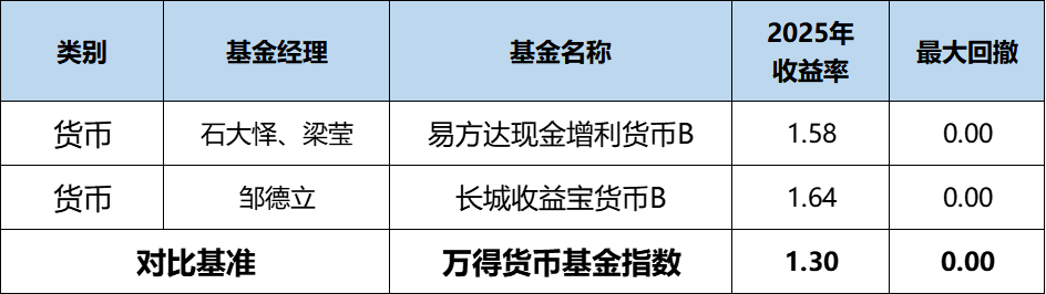 我们选出的两只货基业绩出色,长城收益宝货币2025年业绩排名同类第1,易方达现金增利货币的业绩排名为11/985。