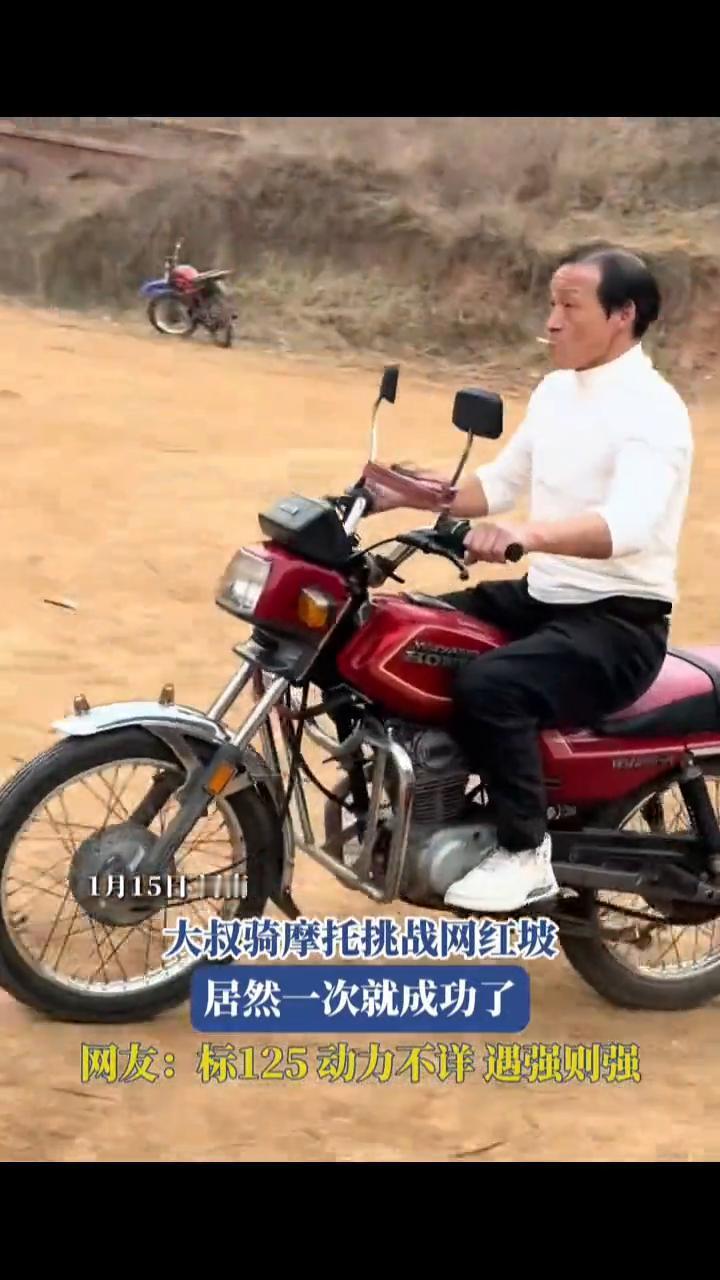 1月15日河南,大叔骑摩托挑战网红坡,居然一次就成功了。 网友:标125动力不详,遇强则强。