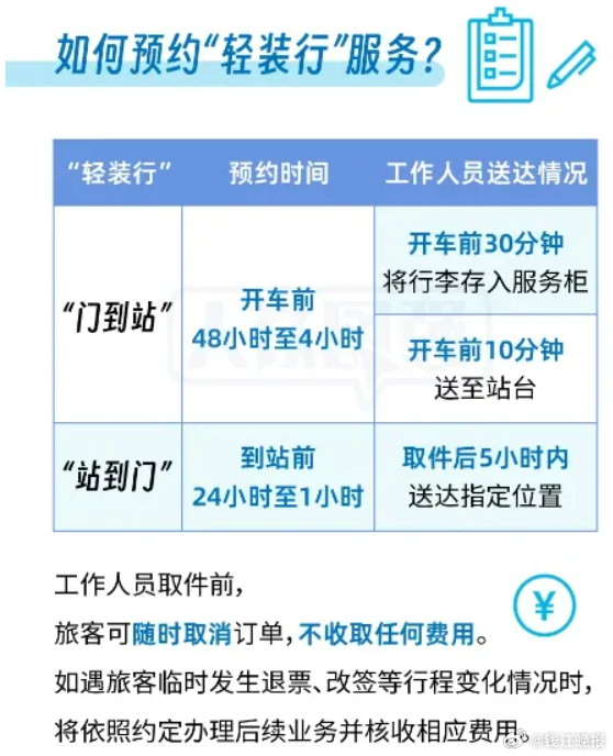 #坐高铁可以不用自己扛行李了#【不用自己拿行李,铁路“轻装行”服务扩大试点范围】据“中铁快运”消息,作为2026年春运便民利民服务举措之一,中铁快运自2026年1月15日起扩大“轻装行”服务试点范围,新增哈尔滨、长春、天津、石家庄、西安、南昌、南宁、乌鲁木齐、拉萨等城市的92个车站,总数达到111个,基本覆盖全国省会城市、直辖市、计划单列市,减轻旅客携带大件行李负担,让乘坐火车出行更轻松。此次扩大试点范围,保持“轻装行”服务的预约方式、受理流程、价格标准等不变。已购车票的旅客可通过铁路12306App、微信小程序及中铁快运微信小程序预约“轻装行”服务。在同城距离车站35公里内,旅客根据实际需要可选择以下两种“轻装行”服务。一是出发旅客“门到站”行李搬运服务。办理从出发地到车站的业务,可在开车前48小时至4小时预约,由工作人员到旅客指定位置上门收取符合托运规定的行李并搬运至出发车站,通过安检后,按照预约要求,在开车前30分钟将行李存入服务柜或在开车前10分钟送至站台。二是到达旅客“站到门”行李搬运服务。办理由车站到目的地的业务,可在列车到站前24小时至1小时进行预约,工作人员在取件后5小时内送达指定位置。“轻装行”服务试点按件计费,价格为“出发地至车站”和“车站至目的地”68元/件,“出发地至所乘列车站台”和“所乘列车站台至目的地”98元/件。试点成熟后,将根据市场需求、运营成本等因素动态调整。对于商务座旅客,在北京西、北京南、广州南、上海、上海虹桥、杭州东6个车站可搬运行李到车站商务座候车厅,服务价格为98元/件。 “轻装行”服务的行李重量和尺寸需符合《国铁集团铁路旅客运输规程》规定,即每名儿童旅客可携带10公斤,每名外交人员可携带35公斤,其他旅客每人可携带20公斤,普速列车单件行李长宽高之和不超过160厘米,动车组列车单件行李长宽高之和不超过130厘米。同时还应符合国家铁路局、公安部公布的《铁路旅客禁止、限制携带和托运物品目录》相关要求。 (新京报 中铁快运)