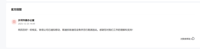针对前述投诉,2025年12月25日,沙河市委办公室作出回复称,经核实,铁塔公司已通知移动、联通拆除通信设备,并另行开展勘测选址工作。
