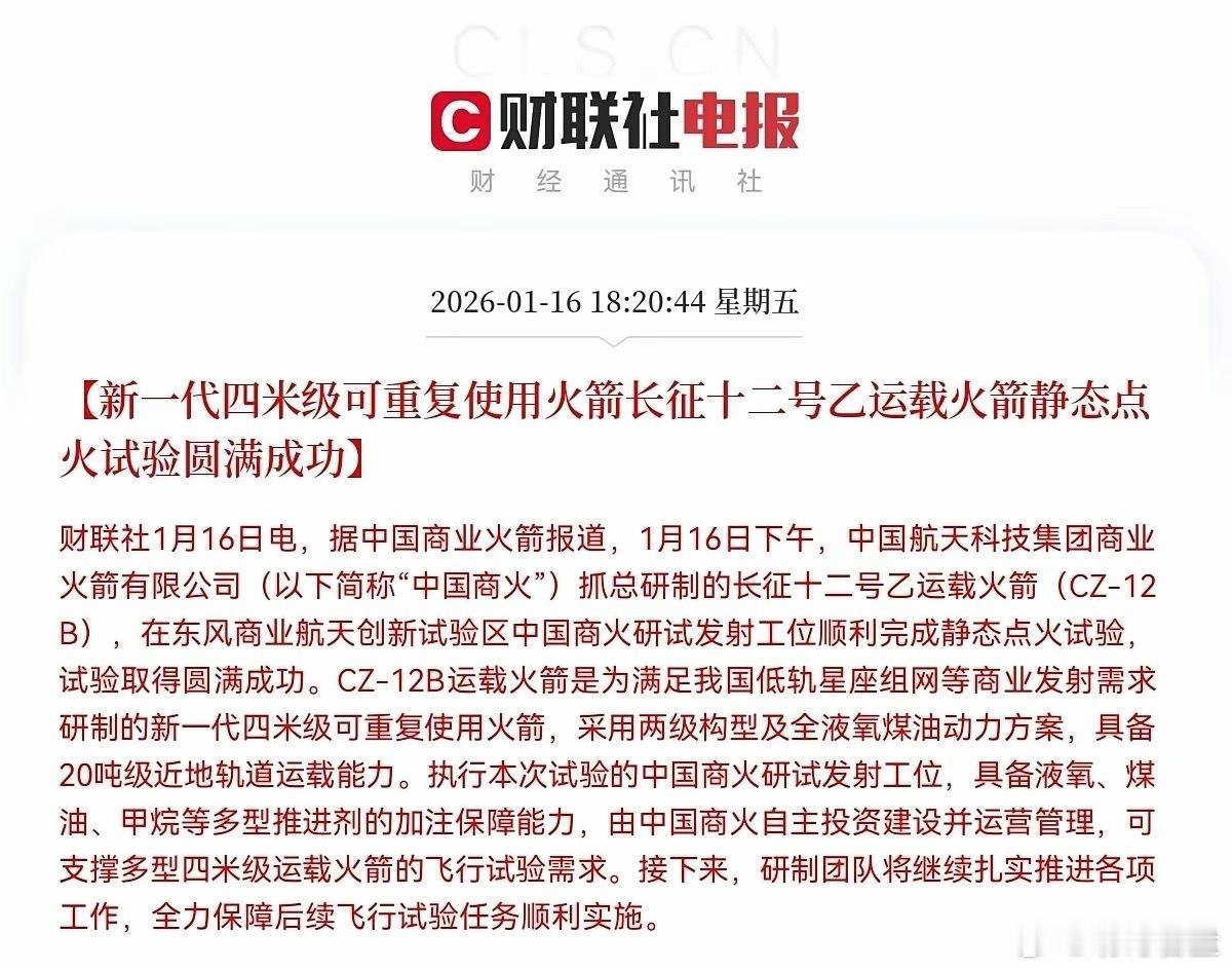 老乡别走!利好!大利好来了!就在刚刚!商业航天大利好消息下周一商业航天预计要王者归来了,持有商业航天的股民们,周末尽情的庆祝起来了吧晚间8点30分,中国商业火箭传来大利好消息,今日下午中国商飞研制的新一代四米级可重复使用的长征十二号乙运载火箭静态点火试验取得圆满成功,此消息一出,股民们乐开花了,商业航天最新催化剂又来了,对于商业航天板块来说是重大利好消息,本次点火试验成功,再次验证了可重复使用技术路线的持续推进,这有助于强化市场对商业航天产业降本增效、加速发展的长期信心,近期商业航天板块对重大技术进展通常反应积极,就在上个月,长征十二号运载火箭成功发射后,板块曾出现显著上涨,这次静态点火试验成功,是商业航天领域一个积极的技术进展,预计下周一能再次提振投资者对商业航天板块的热情,是最大利好消息!股民们!坐稳扶好!受此利好消息刺激,预计下周一商业航天板块有望受到资金的青睐,要大爆发了!