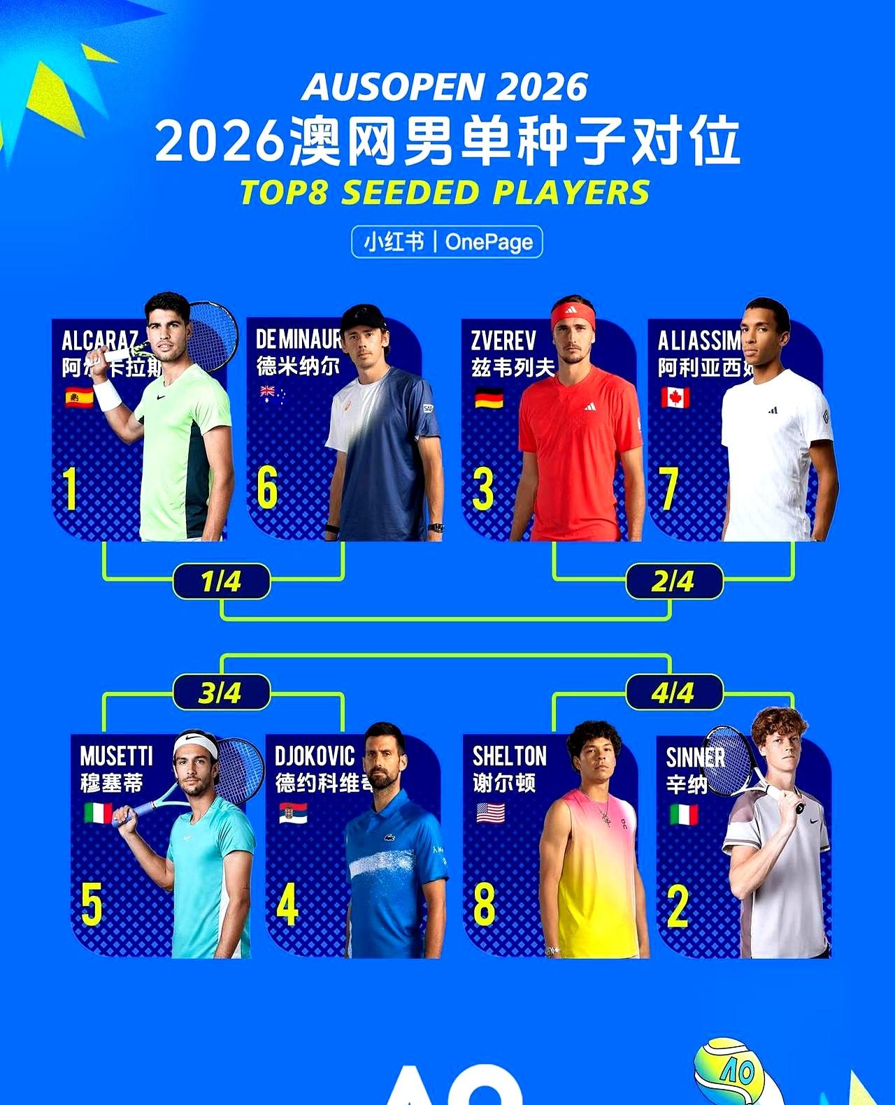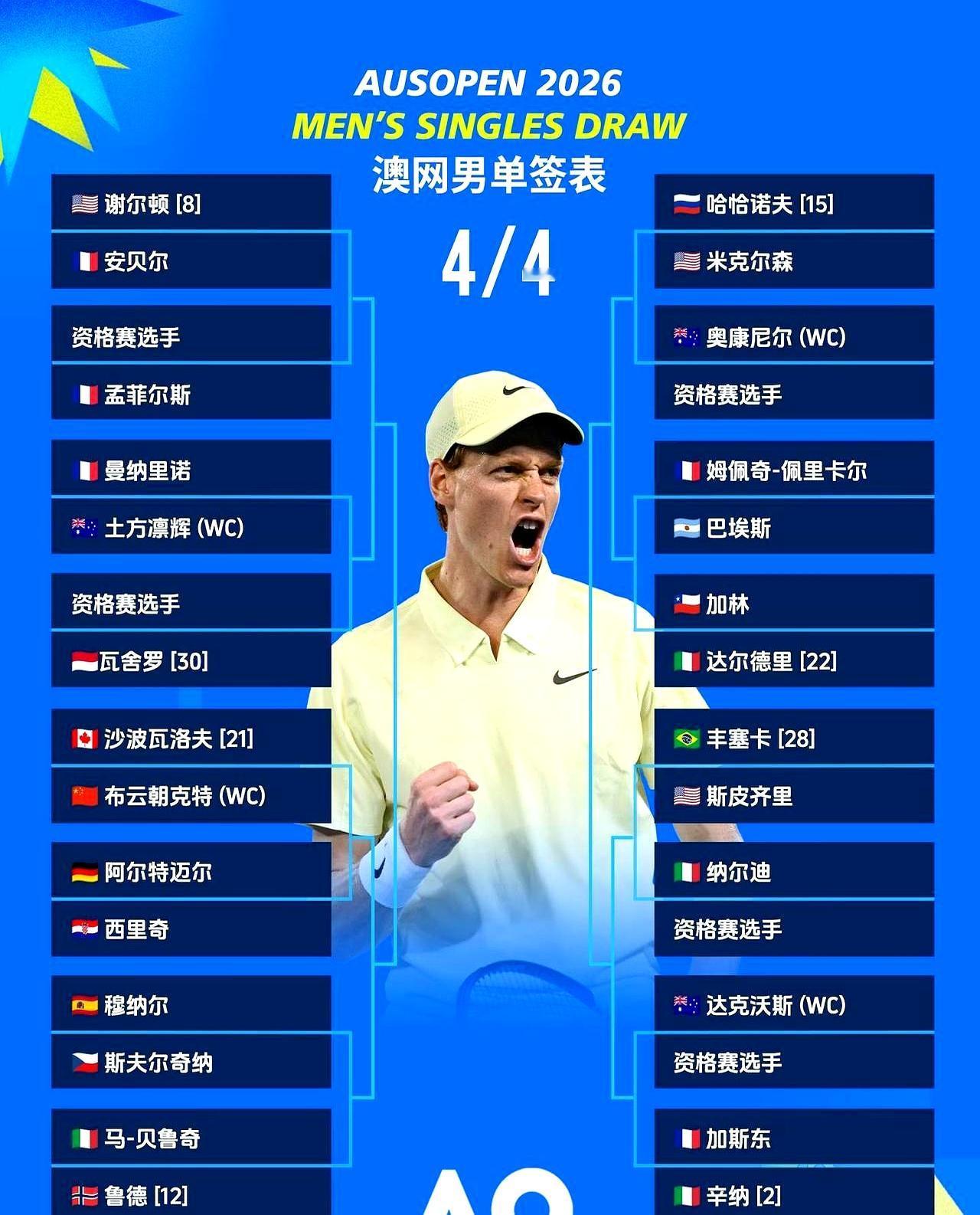 2026澳网签表一贴,火药味冲脸。 上半区,头号种子阿尔卡拉斯首轮就碰本土炮沃尔顿,想拿全满贯得先挨澳洲球迷吼。 同区还有兹维列夫,签硬得像砖头,一步踩空就翻车。 下半区更狠,卫冕冠军辛纳和38岁的德约挤一起。 辛纳冲三连冠,德约追第25个大满贯,俩人要是半决赛相遇,谁输谁尴尬。 德约没打热身赛直接空降,体力是最大问号。 种子排面再豪华,也得一轮轮啃。 第一轮就全是硬仗,老天王和00后正面撞,旧神祭坛和新王加冕,就看谁先掉链子。