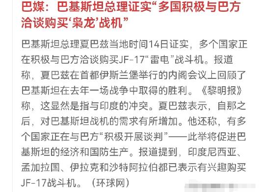 巴基斯坦总理证实了,多个国家在购买“枭龙”战机!合同在签的和已经交付的,据媒体报道总装量已经近200架了,印度尼西亚,伊拉克和孟加拉国都有意向购买。 巴基斯坦总理夏巴兹1月14日在内阁会议上的表态,直接将枭龙战机出口这盘藏了多年的棋摆到了台面上。这番官方盖章比任何媒体爆料都有分量,路透社同期密集放出的独家消息,更把热闹的交易清单扒得明明白白,让传闻中的订单落地为实。 这场军售热潮里,各国买家操作各异,沙特尤为亮眼,直接甩出40亿美元防务协议,还打算将巴基斯坦欠自己的20亿美元贷款,直接转换成战机采购支出。 这种债务置换玩法,既帮巴方缓解债务压力,自己也能零额外支出拿装备,堪称资源利用的极致。沙特此举还间接带动利比亚和苏丹采购,利比亚16架枭龙订单靠沙特资金支持,含配套装备价值25亿美元,苏丹则用15亿美元预算拿下10到12架及配套装备,一笔钱撬动三国防务合作,算盘打得极精。   印尼动作同样果断,防长沙夫里1月12日专程飞抵伊斯兰堡,谈判目标直指40架以上枭龙,还顺带考察巴基斯坦“沙赫帕尔”无人机,显然想一次性完成空军装备升级。 孟加拉国正紧锣密鼓谈判,虽此前传闻拟购48架略显夸张,其还要兼顾歼-10CE和欧洲“台风”采购,经济难以支撑,但结合地缘需求,最终敲定14到20架的可能性极大。 伊拉克也持明确采购意向,加上已交付订单,枭龙合同在签及已交付总装量逼近200架,至少6国已入局或即将入局,曾经的南亚武器进口国,靠枭龙逆袭成地区装备出口强国。   枭龙能引爆市场,核心是踩准了国际军售痛点,性价比优势拉满。其单价稳定在2500万至3000万美元,即便搭载有源相控阵雷达、航电全面升级的Block3型,单价也不超4000万美元。 反观欧美同类型战机,瑞典“鹰狮”E型超5000万美元,美国翻新F-16V也要3000多万美元,法国“阵风”、欧洲“台风”更是动辄七八千万美元。 对想升级装备又不愿掏空国库的中小国家而言,枭龙是最优解,花一半钱就能获得4.5代战机,兼顾制空、对地多任务能力,配备先进电子战系统和超视距导弹,完全满足国防需求。 尼日利亚2021年采购3架,阿塞拜疆2024年直接签下40架订单,实打实的案例印证了其性价比,毕竟不是每个国家都有美国级别的军费,务实才是王道。   2025年印巴空战,更给枭龙的实战能力盖了戳,让观望国家彻底放心。当时巴基斯坦空军的枭龙搭载霹雳-15导弹,展现强悍制空能力,还给印度空军造成实质威胁,这种战场背书远胜任何宣传。 国际军售中,多数战机要么只停留在纸面数据,要么缺乏实战检验,买家难免顾虑,而枭龙用表现证明自己绝非花架子。 有趣的是,枭龙搭载俄罗斯RD-93系列发动机,最新RD-93MA推力更足,俄方为不得罪印度这个大客户,特意通过中国转卖发动机,这种迂回操作,反倒印证了枭龙的市场吸引力,连供应商都愿为它平衡地缘关系。 此次空战中,枭龙Block3型还曾携带CM-400AKG导弹,摧毁印度部署的S-400防空系统发射组,巴方公布的卫星照片虽存争议,但相较于印度无证据的战报更具说服力,进一步打响了名气。   对巴基斯坦而言,这场军售热潮早已超越卖武器本身,更是解经济燃眉之急的救命招。巴方当前外汇储备刚超145亿美元,勉强达标IMF设定的139亿美元目标,政府债务总额高达76.045万亿卢比,外债近22.59万亿卢比,长期依赖IMF救济包过活,手头IMF项目额度仅几十亿美元。 而目前明确的枭龙订单已超110亿美元,若能兑现大半,外汇压力将大幅缓解,这也难怪国防部长阿西夫底气十足,宣称半年内或摆脱对IMF的依赖。 靠军售破解主权债务危机,这种玩法在国际博弈中堪称狠招,既赚外汇、提话语权,又能通过防务合作绑定盟友,对巴方而言一举多得。   反观印度的反应,从质疑到焦虑的转变颇为狼狈好笑。起初印度根本不信,资深写手在《欧亚时报》发文,硬说消息源头单一,是巴方自导自演的宣传。 可待巴方官方确认、订单细节曝光,新德里立刻改口,《印度斯坦时报》翻出空战旧账纠结战果,妄图削弱枭龙实战背书,本质就是接受不了对手装备在国际市场走红。 憋屈的是,印度想采购轻型战机替代米格-21,将单价限定在4000万美元以下,却在国际市场四处碰壁,而枭龙刚好卡在这个价格区间且销量火爆,对比之下更显窝火。 印度还曾施压俄罗斯停止供应发动机,可俄方既要赚印度的钱,又舍不得枭龙这块肥肉,根本不予理会。印度只能眼睁睁看着枭龙在国际市场攻城略地,却无有效应对之法,这种无力感才最让人难受。