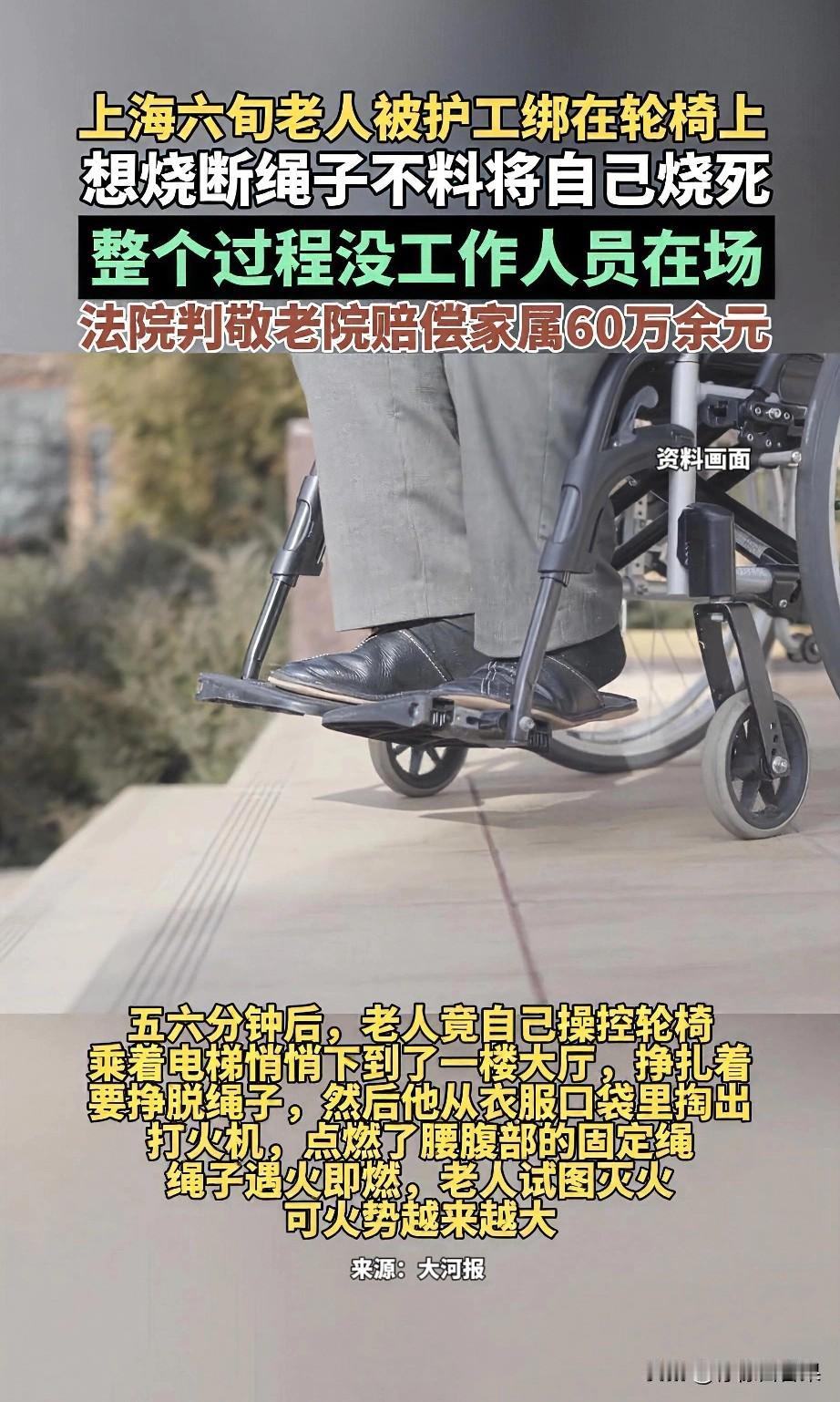 2025年2月12日凌晨3点36分,上海一家敬老院的大门外,火焰吞噬了6旬老人老刘的身体——他从轮椅上痛苦滑落,最终因火灾不幸身亡。而这场悲剧的源头,竟是一根护工用来“防止他摔倒”的尼龙绳。 老刘本来就有4级残疾,左腿跛脚,之前还在敬老院摔过跤,头上撞了个洞,五根肋骨加一根锁骨都折了,刚养好伤没几天。凌晨2点多他想起床,护工孙某忙着顾别人,劝不动就图省事,找了根尼龙绳从他腋下穿过,死死绑在轮椅靠背上,让他自己根本解不开,转头就走了。 也就五六分钟的功夫,老刘自己摇着轮椅乘电梯下了一楼。3点25分,他掏出衣服口袋里的打火机,想烧断绳子自救,可那尼龙绳一点就着,烧断后着火的绳子垂到轮椅两边,瞬间就把轮胎引燃了!老刘行动本来就慢,还跛着脚,挪到门外想用垫子拍灭火,可火越烧越大,3点36分就把他整个人裹住了,他从轮椅上滑下来,期间全程没一个工作人员! 4点多警察来了,人早就没了! 这哪是“养老”?这简直是把老人当成了麻烦,用绳子一捆就了事。专业护理有约束带、有防坠床设备,护工却图省事用尼龙绳,连最基本的安全意识都没有。 更可怕的是管理漏洞:老人能拿到打火机,说明危险物品没人管;出事全程没人发现,说明夜间巡查没做到位。家属索赔198万,法院判了60万。 这件事最让我难过的是,本来把老人送到敬老院,是希望他们能得到更好的照顾,而不是让他们在恐惧和孤独中离开。 养老不是“把人看住就行”,而是要让老人活得有尊严、有安全感。 这需要护工多一点耐心,机构多一点责任心,监管多一点用心。毕竟,谁都有老的一天,今天我们如何对待老人,明天就会被如何对待。