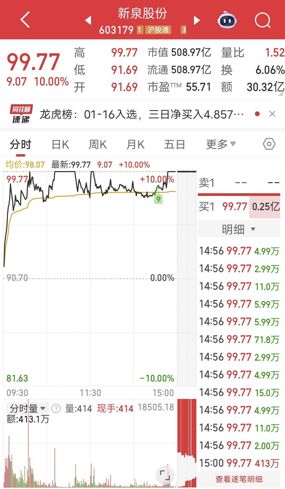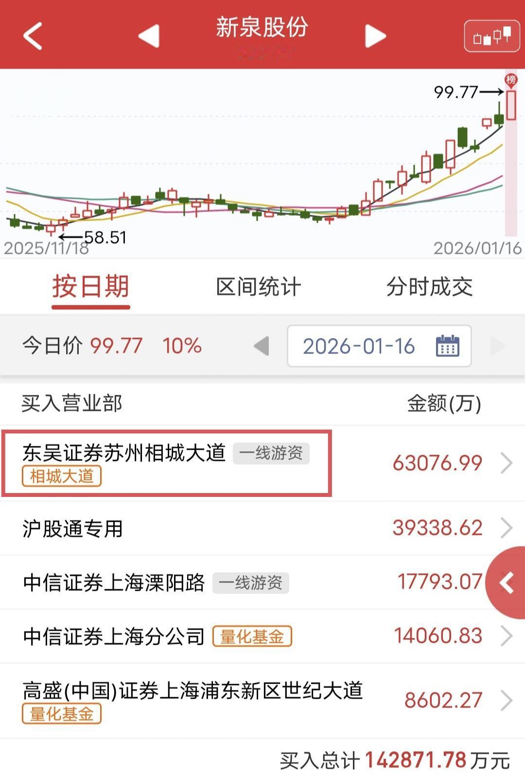 相城大道爆买6.3亿: 周五新泉股份尾盘涨停。 盘后龙虎榜显示,相城大道爆买6.3亿,溧阳路跟买。 上次航天发展让利7000多万,这次别人都在休息,他还在猛干,太猛了吧! 游资
