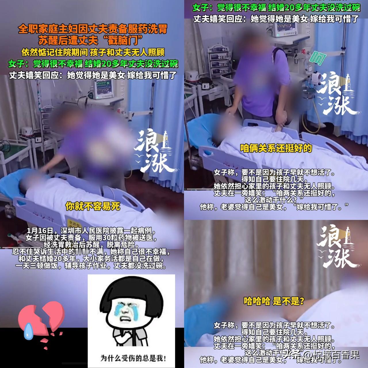 “结婚20年,没让丈夫洗过一次碗!吞下30粒安眠药洗胃后,等来的却是丈夫戳着脑门嘲讽:‘你就不容易死’!” 深圳人民医院披露的这起真实案例,看完让人浑身发抖。这位全职妈妈用20年的付出,换来的不是珍惜,而是诛心的冷漠。 事情发生在1月16日,这位妈妈因为长期遭受丈夫责骂,终于在一次争吵后彻底崩溃,吞下30粒安眠药试图结束这一切。经过紧急洗胃抢救,她虽然捡回了一条命,却在病床上迎来了更让人心寒的一幕——丈夫嬉皮笑脸地用手指戳着她的脑门,轻飘飘地调侃:“你不容易死”。 躺在病床上的她虚弱地哭诉,结婚20多年,家里从一天三顿饭、洗衣拖地到辅导孩子作业,所有大小家务都是她一个人扛,丈夫连一次碗都没洗过。她甚至绝望地说:“没有孩子,我早就不想活了。” 最讽刺的是,她刚从昏迷中醒来,第一反应不是关心自己的身体,而是惦记着“孩子和丈夫在家没人照顾”。她用20年的时间活成了丈夫的“免费保姆”和“情绪垃圾桶”,却连一句心疼都换不来。 婚姻不是让你当免费保姆,更不是让你当他的情绪垃圾桶。要是你累死累活,他觉得理所当然;你委屈掉眼泪,他觉得你没事找事,那真的该醒醒了——这样的日子,过着还有啥劲? 评论区聊聊吧:你在婚姻里最寒心的瞬间是什么?咱们一起抱团取暖!