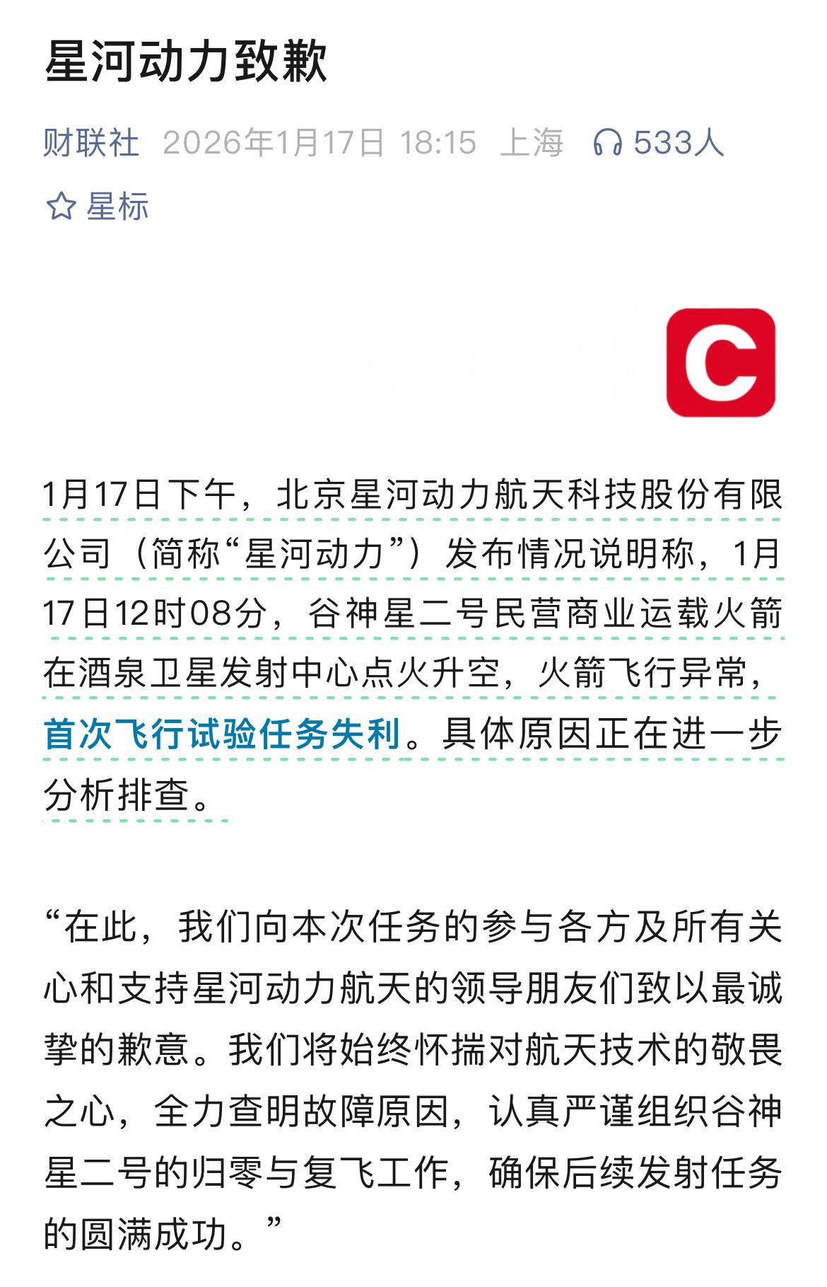 国内商业航天任重道远啊[流泪][流泪] 今天SpaceX发射🚀成功 国内两个发射🚀失败 与SpaceX还有很大差距,要迎头赶上啊[点亮平安灯] SpaceX以前也失败过很多次,现在不也成功了吗! 国内航天后面也肯定会越来越好的![点亮平安灯][点亮平安灯] 没想到谷河动力还特意发了个致歉信[流泪][流泪],有点心酸[融化] 马斯克的 SpaceX 失败了多少次?从来没人要求他道歉。我们的航天人,同样不需要为正常的失败道歉。少一点苛责,多一点理解;少一点急功近利,多一点耐心支持。 航天事业,需要的是长远的眼光,不以一时的成败论英雄![点亮平安灯] 不过,目前商业航天第一阶段的纯概念的炒作过去了,接下来应该是更多的鼓励真正的航天硬科技了! 虽然短期商业航天有波动,长期还是不改变商业航天的景气产业趋势! 最后附两首诗 第一首: 一从大地起风雷,便有精生白骨堆。 僧是愚氓犹可训,妖为鬼蜮必成灾。 金猴奋起千钧棒,玉宇澄清万里埃。 今日欢呼孙大圣,只缘妖雾又重来。 第二首: 自小刺头深草里,而今渐觉出蓬蒿。 时人不识凌云木,直待凌云始道高。 时人不识商业航天,直待商业航天发展起来才觉得高呀[融化][融化][融化]
