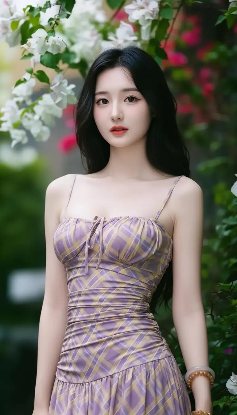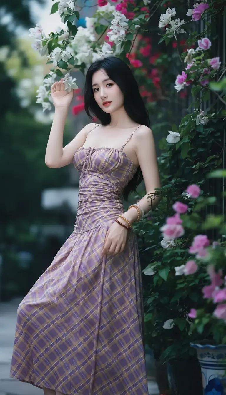 在花丛中,优雅地坐着,享受宁静的午后时光。现代最美的女性是什么样子?