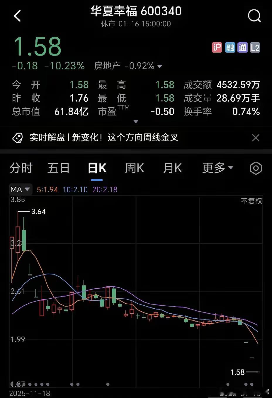 华夏幸福暴雷,已吃了四个跌停了,估计还得有好几个跌停。查了下,华夏幸福的股东竟然有中国平安,人家直接投了十个亿在里面,现在中国平安股价也被受累,从最高处已下跌8元了。有网友说,平安好不容易涨上去了,一片向好,没想到这几天极速下跌,原来是华夏幸福这个雷影响的。华夏幸福这只股,估计得面临退市命运了,短期内根本无法扭转困局。这让我想到了那个万科,也是半死不活,现在很多游资在赌,万科能不能扭转回来?