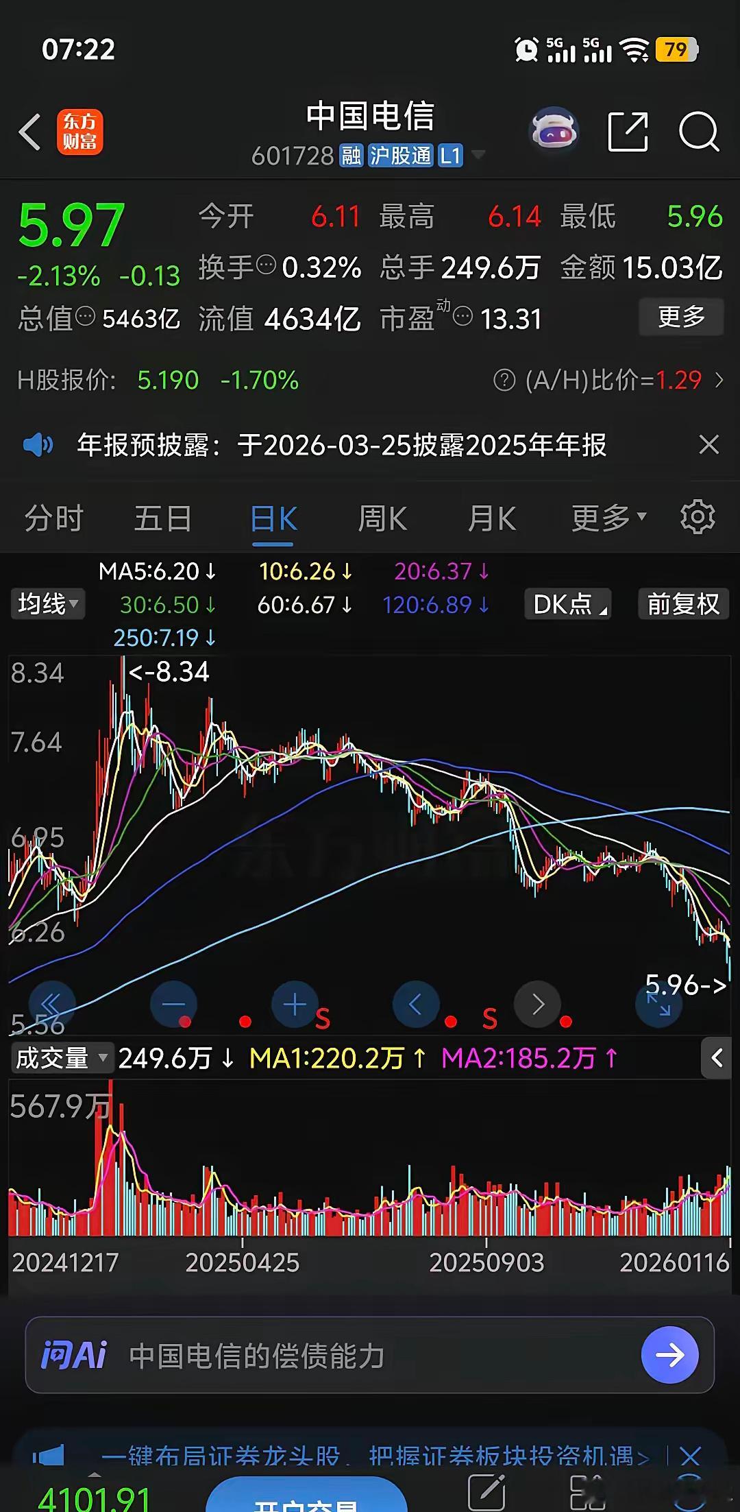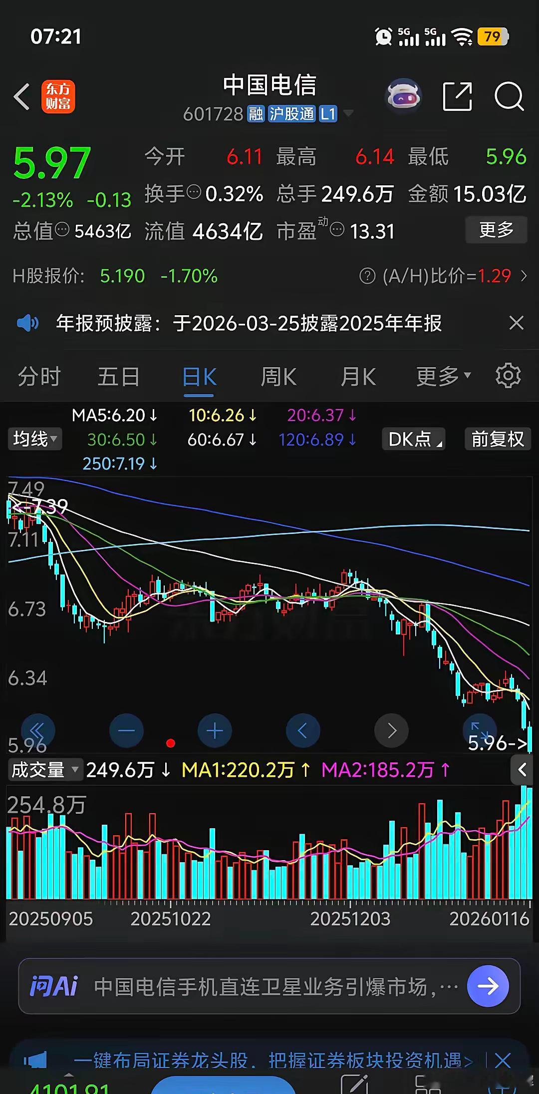 中国电信跌的太惨了,瀑布式暴跌一波接着一波,周五高开冲高回落后一路暴跌,恐慌盘不断杀出不少股民纷纷割肉,惨不忍睹,收盘跌破6元关口,成交额高达15.03亿,明明是天天几万亿的大牛市中国电信本周却连续下跌4天,6元关口都守不住,市盈率仅13.31,现在股息率高达4.59%远远超过银行存款,别的蓝筹股下跌可能是业绩下滑,但是中国电信没有,三季报净利润还增长5%,长期价值投资者千万不要割肉了。