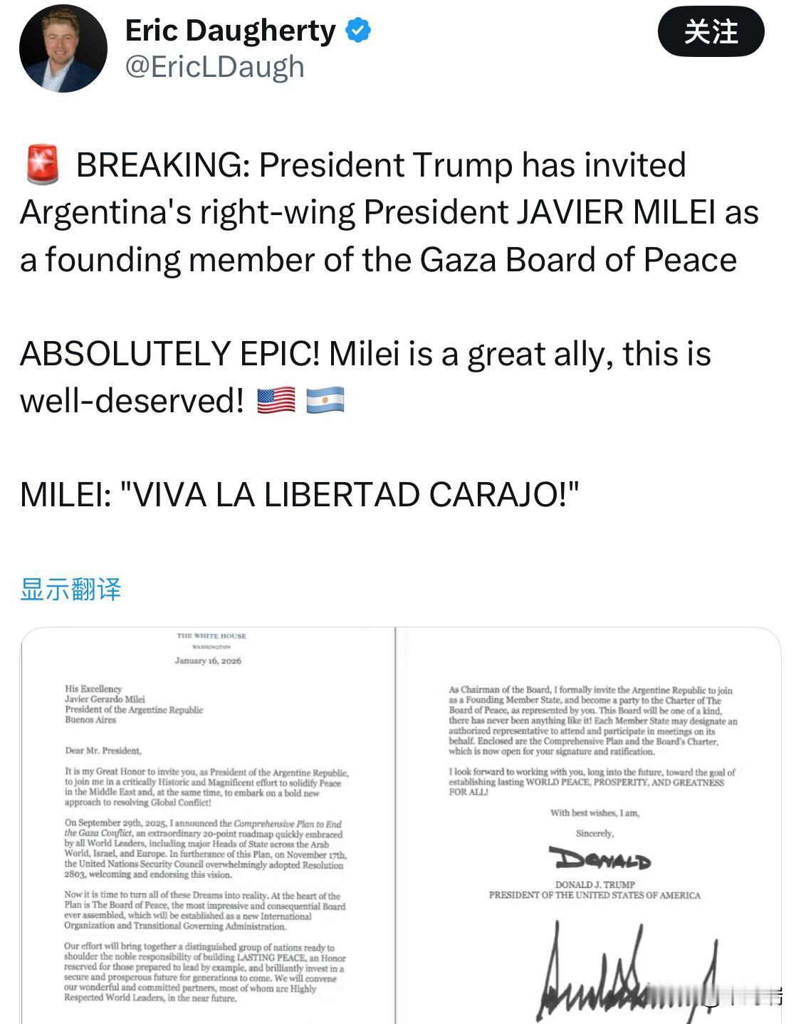 突发新闻:特朗普总统已邀请阿根廷右翼总统哈维尔·米莱担任加沙和平委员会创始成员。 阿根廷总统哈维尔·米莱(Javier Milei)证实他收到了唐纳德·特朗普(Donald Trump)的正式邀请,邀请阿根廷作为创始成员加入“和平委员会”(Board of Peace)。 关于“和平委员会” 倡议背景: “和平委员会”是特朗普“结束加沙冲突全面计划”(于 2025 年 9 月 29 日公布)的核心部分,旨在监督战后加沙的过渡治理和重建工作。 联合国认可: 该计划获得了广泛的国际支持,包括阿拉伯和穆斯林国家,并且联合国安理会于 2025 年 11 月 17 日通过了第 2803 号决议,认可并支持了该愿景和“和平委员会”的建立。 成员构成: 特朗普将担任该委员会的主席。其他已确认或被邀请的成员包括美国国务卿马可·卢比奥(Marco Rubio)、英国前首相托尼·布莱尔(Tony Blair)、世界银行行长彭安杰(Ajay Banga)以及土耳其总统埃尔多安(Recep Tayyip Erdogan)等。 职责范围: 该委员会将承担治理能力建设、区域关系协调、重建、吸引投资和资金调动等职责,旨在帮助加沙实现长期稳定与繁荣。 阿根廷的加入: 米莱总统表示很荣幸能加入该倡议,并借此机会重申了阿根廷在外交政策和反恐斗争方面的立场。