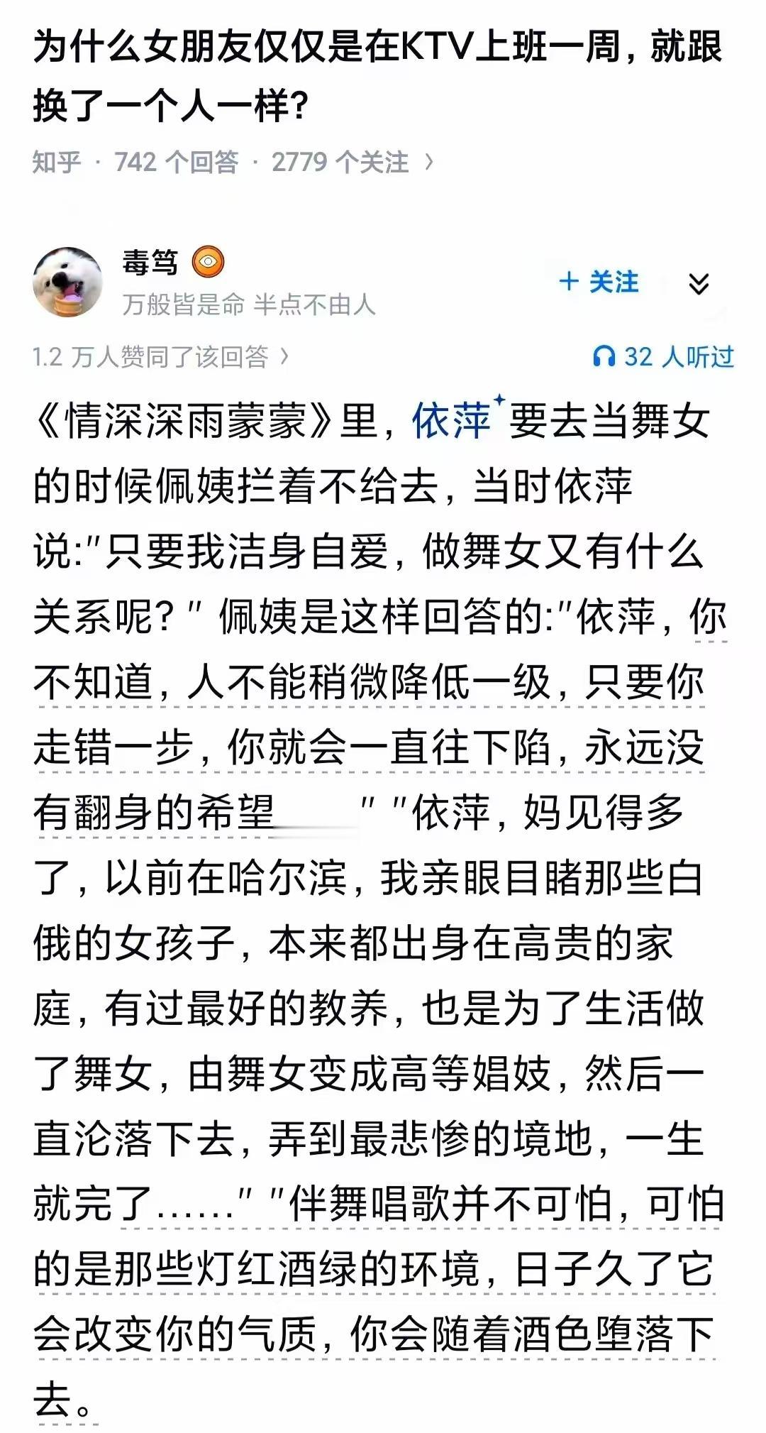 小时候看到依萍去舞厅,信奉的是“出淤泥而不染”。现实中不可能会有秦五爷,堕落是分分钟的事。 原著就当了一晚舞女,就不干了,最后家败,房子卖了分了一半,没什么负担。新版这个,养全家养李家,最后还要养一院子孤儿,女主不能堕落怎么办?只能编个圣母老大护着了。 由俭入奢易,由奢入俭难。很多奢侈的日子过习惯了,在过苦日子,比杀了他还痛苦。 由奢入俭,这几十年,我知道最有名气的一个应该是史玉柱,先发财,再破产欠2.5亿,然后东山再起。 界限一旦开始模糊,跨过去也就理所应当了。 小时候看琼瑶,惊艳于她的理念情大于天,现在看琼瑶,只适合把声音字幕都关了看看美女。 想得出来的,这种人家的孩子做舞女,外交官男朋友家还能接受,祖宗八代的脸面都丢光了。就是现代,有多少小康之家能接受?