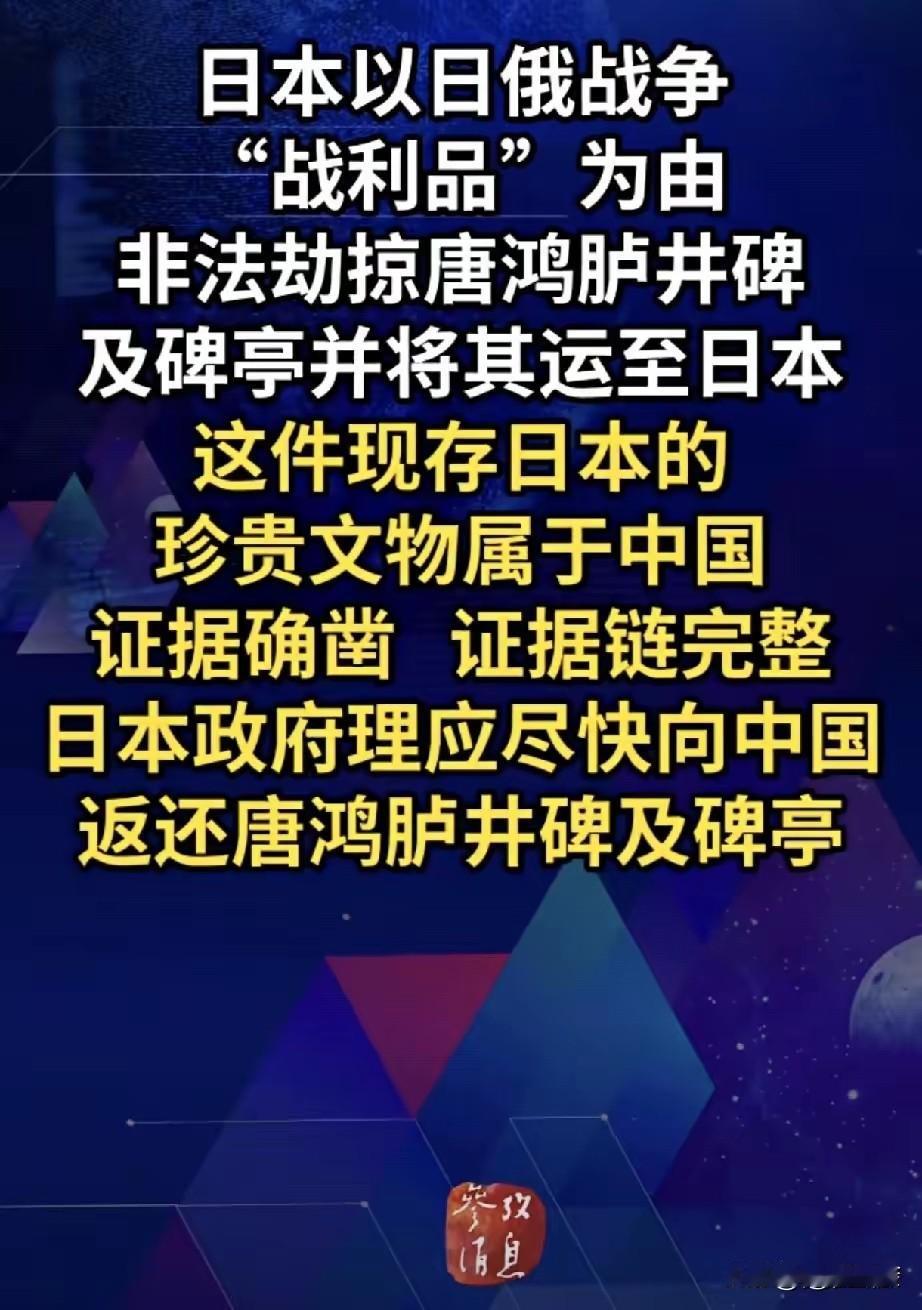 我们对日本正在进入了下一个阶段! 据参考消息的报道,唐鸿胪井碑被日本当作日俄战争的“战利品”抢走一百多年,如今终于被摆上台面:证据确凿,必须归还。 我们对日本的态度,正从过去的“隐忍”转向“主动”。以前,我们忙着发展,谈着合作,很多事都按下不表;现在,我们开始理直气壮地索要文物、讨回公道。 字里行间都是我们不再沉默的信号。这块石碑不只是石头,更是历史的欠条。当我们敢把欠条拍在桌上,就说明,属于我们的东西,迟早要一件一件拿回来。这一转变,彰显着我们国家的底气与自信。曾经,我们在发展的浪潮中埋头前行,为了大局选择暂时搁置一些历史遗留问题。但如今,随着综合国力的不断提升,我们有了更坚实的后盾去直面这些过往的伤痛。 唐鸿胪井碑的归还问题只是一个开端。在历史的长河中,日本从我国掠夺走的文物珍宝不计其数,它们就像散落在外的游子,承载着中华民族的记忆与情感。我们主动出击,是对历史负责,也是对子孙后代负责。 未来,我们会以更加坚定的姿态,在各个领域维护国家的合法权益。无论是文化遗产的回归,还是领土主权的捍卫,我们都不会再退缩。因为我们深知,只有让历史的真相大白于天下,让失去的珍宝重归故土,我们才能真正书写属于中华民族的辉煌新篇章。相信在不久的将来,会有更多被掠夺的文物回到祖国的怀抱,历史的伤痛也终将在我们的努力下得以抚平。