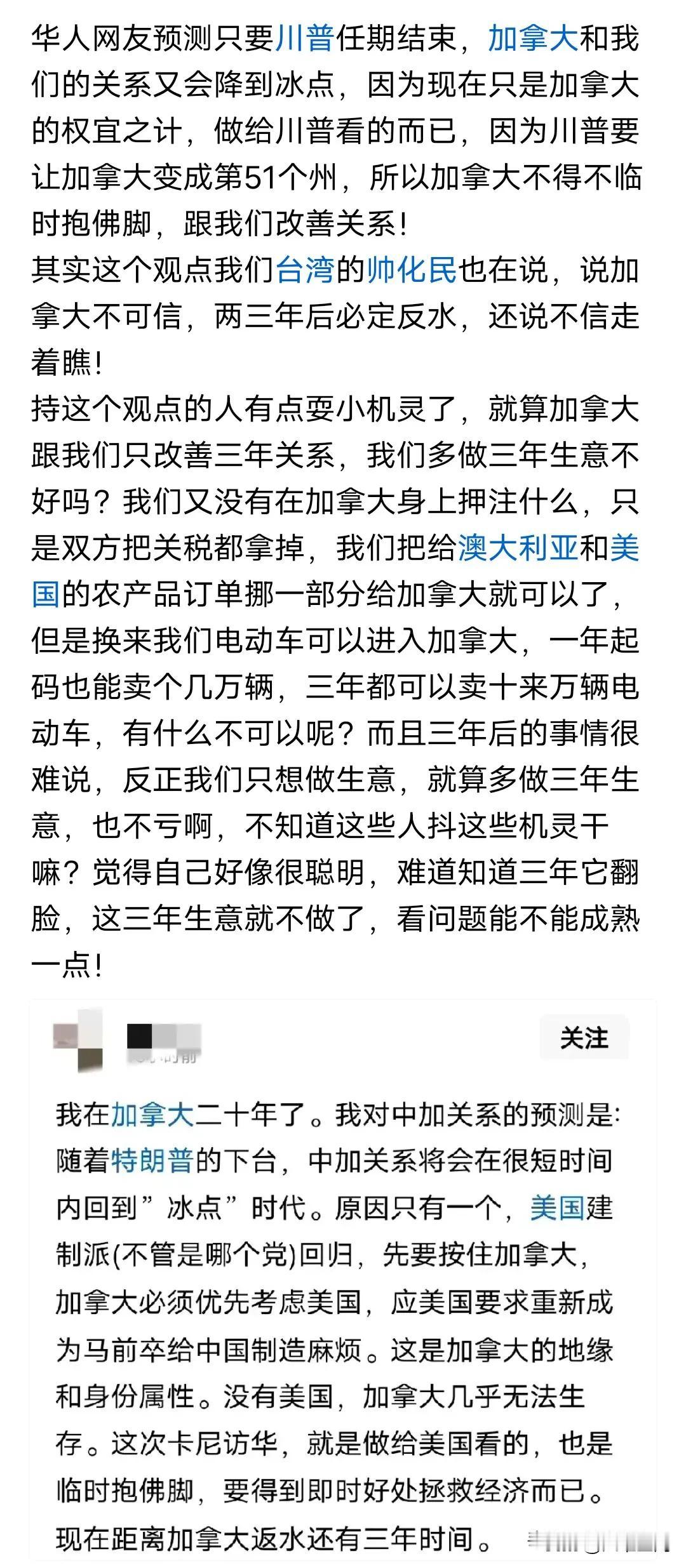 加拿大总理眼神清澈多了,直言中国比美国更加稳定且了可预测,以前的嚣张劲没了,不得不说川普真的间接帮了我们很多,帮我们打开一些不太可能打开市场,这次加拿大放开我们的电动车进去了,关税从100%降到6.1%,每年不超过5万辆就可以,加拿大也就4000多万人口,一年汽车销量也就160万左右,现在放开一个口子给我们进去,已经足够了,反正我们只是买点油菜籽就可以了,何乐而不为呢?还有人在说加拿大不可信,三年后川普任期结束,加拿大又会反水,那又有什么关系呢,反正这三年的生意先做了再说,难道你会因为它三年后可能反水,不要这三年生意吗?反正我们现在的主要目标就是做生意,哪怕是多做一单生意都可以,三年反水就反水,又有什么关系呢?
