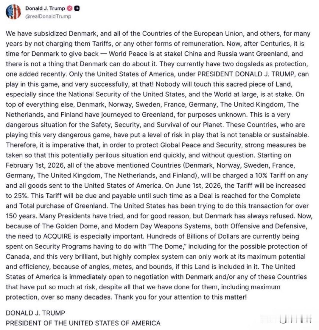突发新闻:2026年1月17日特朗普宣布将对向格陵兰岛派遣士兵的欧洲国家2月1日起征收关税10%,6月1日起25%(留下了缓冲时间)。 🇩🇰丹麦 🇩🇪德国 🇫🇷法国 🇬🇧英国 🇸🇪瑞典 🇫🇮芬兰 🇳🇴挪威 特朗普声称,美国多年来一直通过不征收关税的方式补贴丹麦和欧盟国家,现在是“回报”的时候了。 他认为“世界和平正处于危险之中”,因为中国和俄罗斯想要格陵兰岛,而丹麦“无能为力”,只拥有“两只狗拉雪橇”作为保护。 他强调,格陵兰岛对于美国的国家安全至关重要,特别是对于他计划建造的“金色穹顶” (Golden Dome) 导弹防御系统来说是“至关重要的”。