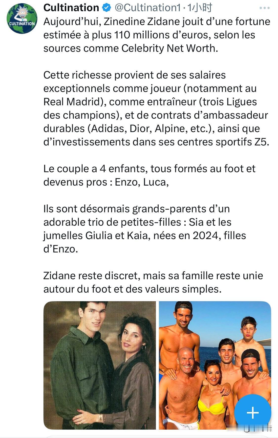 这篇X平台发表的文章,介绍了法国足球传奇人物齐内丁·齐达内(Zinedine Zidane)的财富和家庭情况。 齐达内的净资产估计超过1.1亿欧元(根据 Celebrity Net Worth 的数据,约为1.2亿美元)。他的财富主要来自球员和教练时期的丰厚薪水(尤其是在皇家马德里),以及与阿迪达斯(Adidas)、迪奥(Dior)和Alpine等品牌的长期代言合同。他还投资了自己的 Z5 体育中心。 他与妻子育有四个儿子:恩佐(Enzo)、卢卡(Luca)、西奥(Théo)和埃利亚兹(Elyaz),他们都在足球领域接受过训练并成为了职业球员。 齐达内现在已是祖父,他的长子恩佐和妻子育有三个女儿:Sia(出生于 2022 年)以及双胞胎 Giulia 和 Kaia(出生于 2024 年)。 尽管齐达内已是名人,但他本人保持低调,家庭生活围绕着足球和简单的价值观。 这篇帖子提供了齐达内职业生涯成功转型和幸福家庭生活的详细信息。