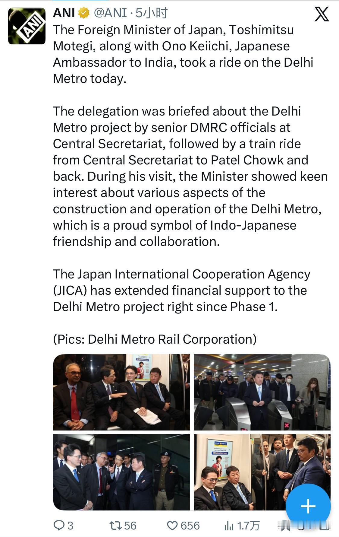 今天,日本外相茂木敏充与日本驻印度大使小野圭一一同乘坐了德里地铁。 代表团在中央秘书处听取了德里地铁公司高级官员关于德里地铁项目的简报,随后乘坐地铁从中央秘书处前往帕特尔广场站并返回。访问期间,部长对德里地铁的建设和运营的各个方面表现出浓厚的兴趣,德里地铁是印日友谊与合作的骄傲象征。 日本国际协力机构(JICA)从德里地铁项目一期工程开始就为其提供财政支持。