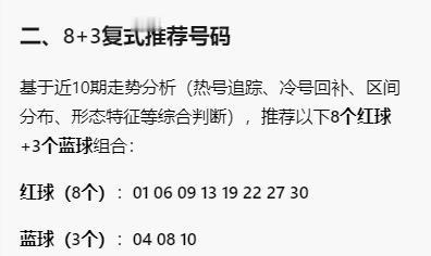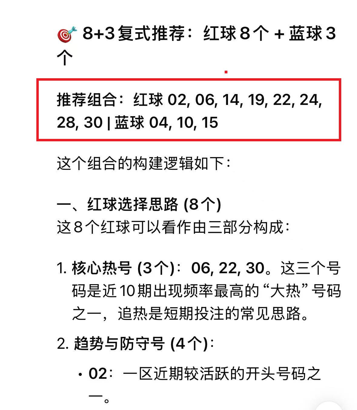 两大AI今日同场争锋——“元宝”与“Deepseek”各展身手,对双色球第26008期展开数据预测。究竟谁能更胜一筹?其中提问的巧思、分析的过程,在此暂且不表,我们直接呈现最终的8+3推荐结果。 从中可见,红球方面,双方共同看好的号码包括:06、19、22、30;蓝球方面,则一致聚焦于04与10两码。 温馨提醒:人工智能分析仅为娱乐参考,并非投注指南,还请理性参与,量力而行。