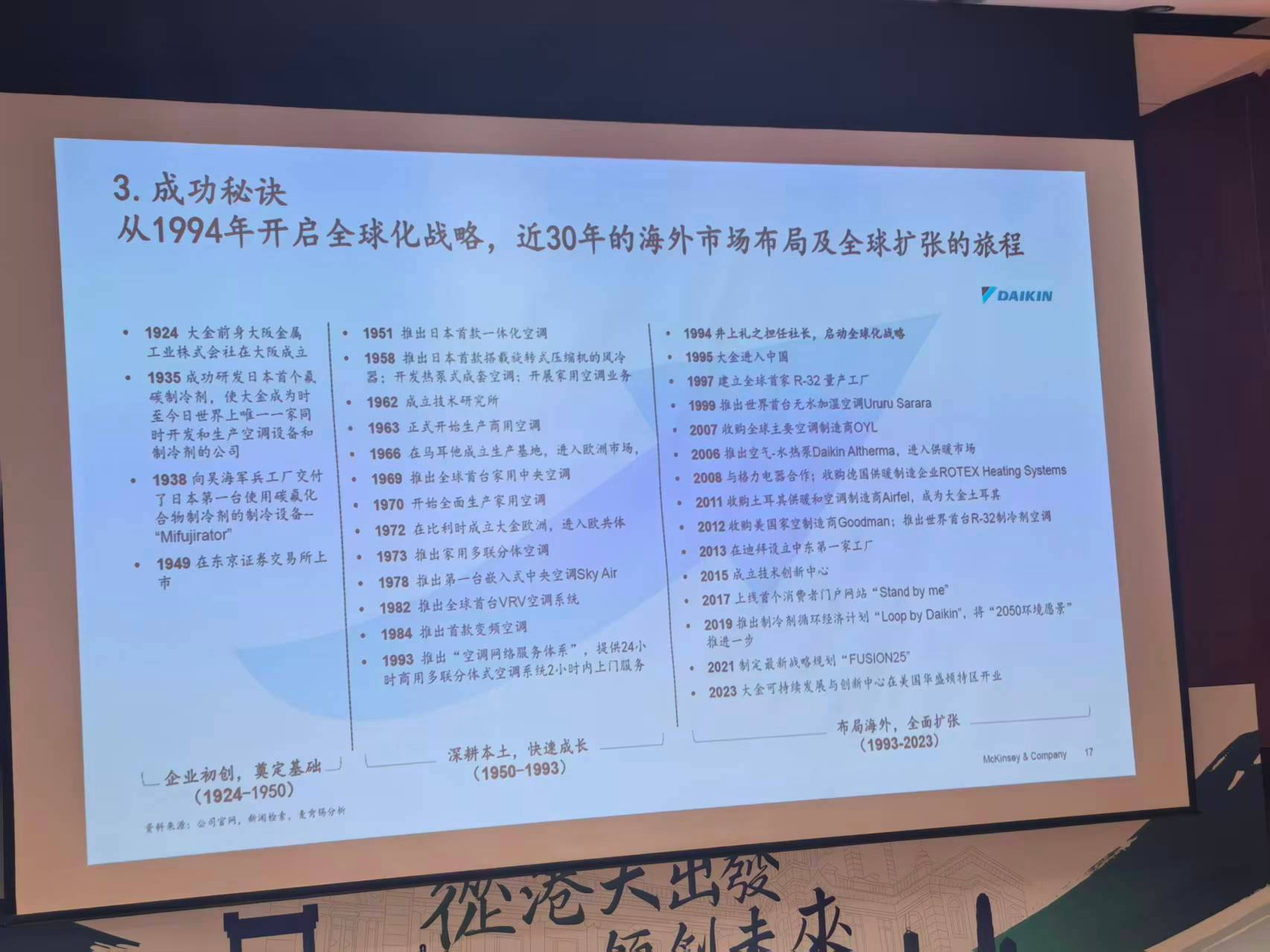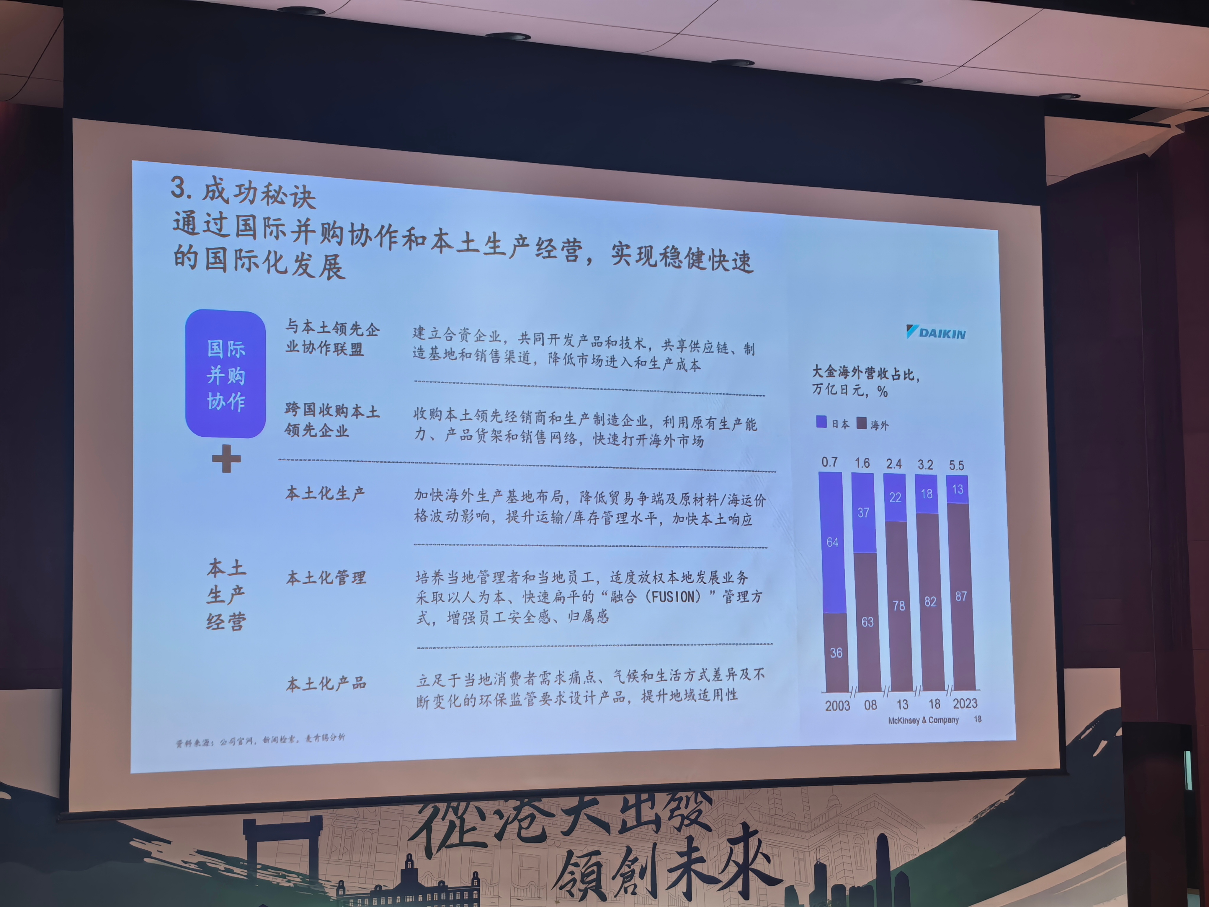 有些日本企业的出海经验是值得学习的,比如做空调的大金大金出海不是走得早,而是走得“深”。从 1990 年代起,大金就明确放弃“只在日本生产、向海外出口”的路径,而是选择并购当地企业 + 本地建厂 + 本地管理。这一步决定了它后来海外收入占比能长期稳定在 80% 左右,海外市场成为“主战场”,而不是补充市场。麦肯锡分析了大金的案例,在分享中提到,本土化并非没有代价:建厂周期长、成本超支、爬坡慢,甚至短期业绩承压。但大金仍然坚持,因为它要的不是短期效率,而是在当地形成完整的生产、渠道和服务能力。更重要的是,大金把研发、管理和决策逐步下沉到海外市场,而不是永远靠日本总部“遥控”。它出海的本质,是把自己变成一家“全球本地公司”,而不是一家会出口的日本企业。