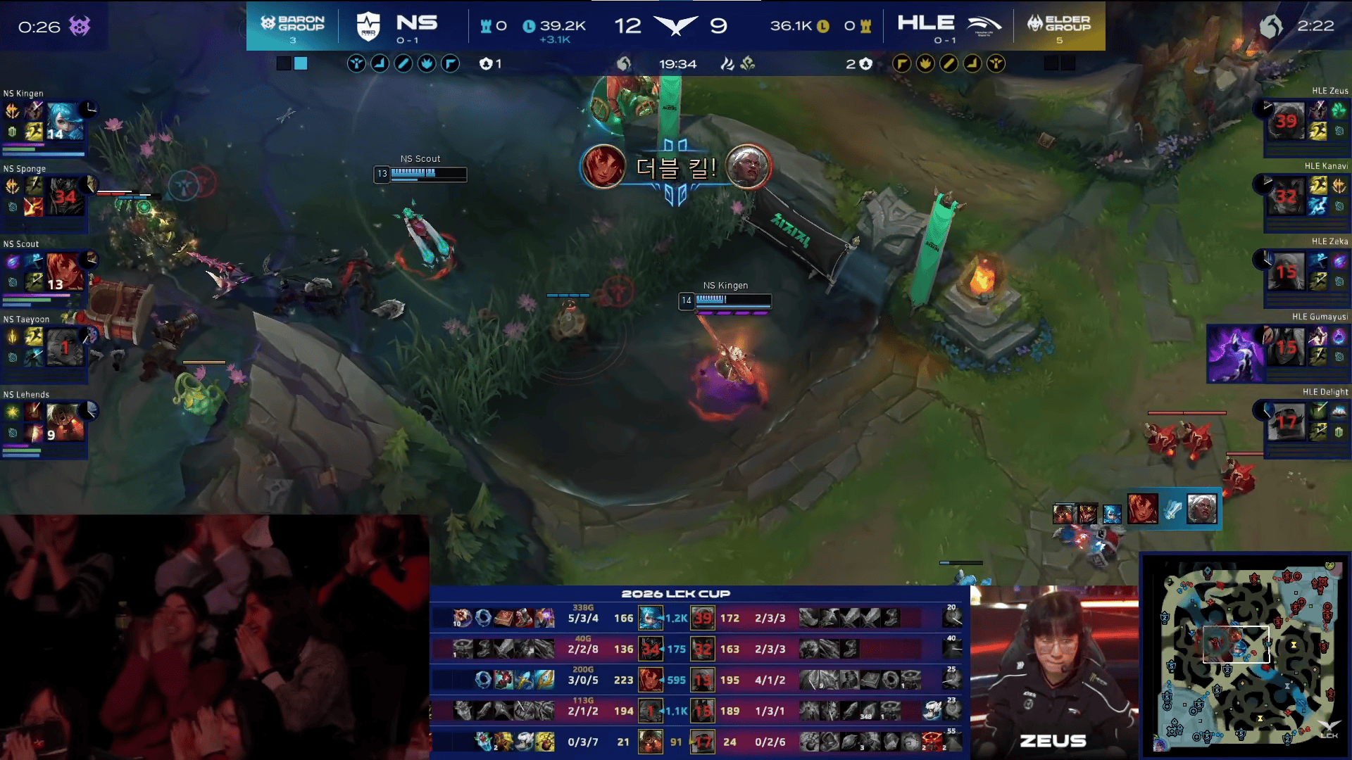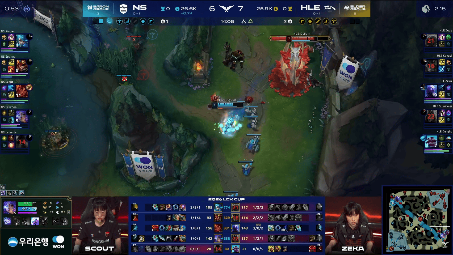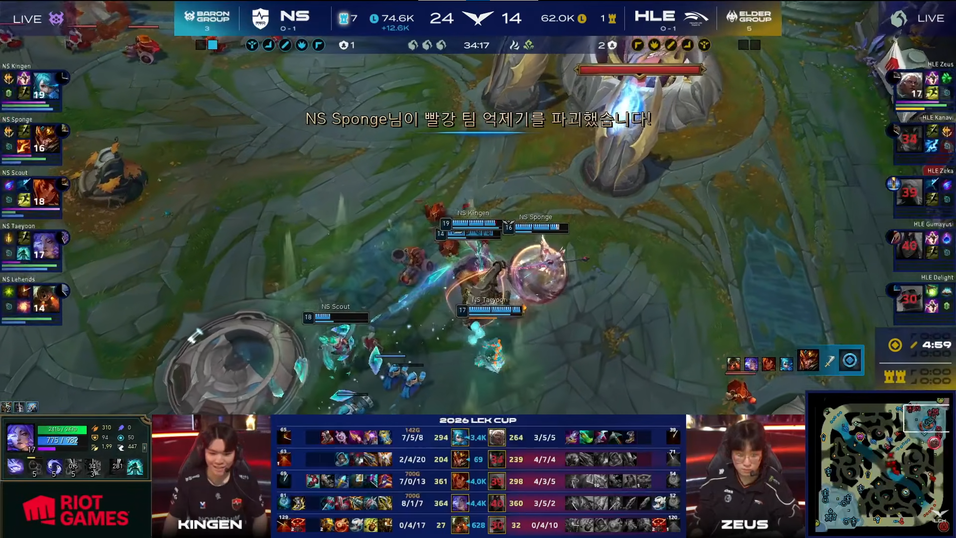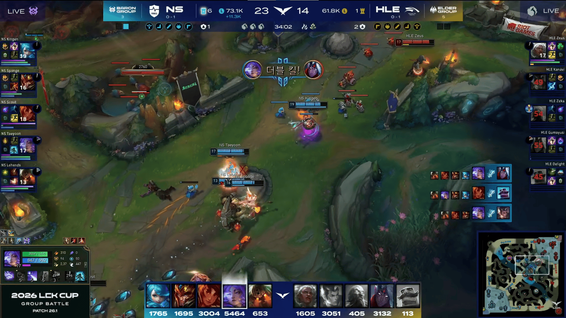 比赛第19分钟,两队在河道爆发混战。Kingen格温强势进场帮助NS打出2换5团灭HLE。
