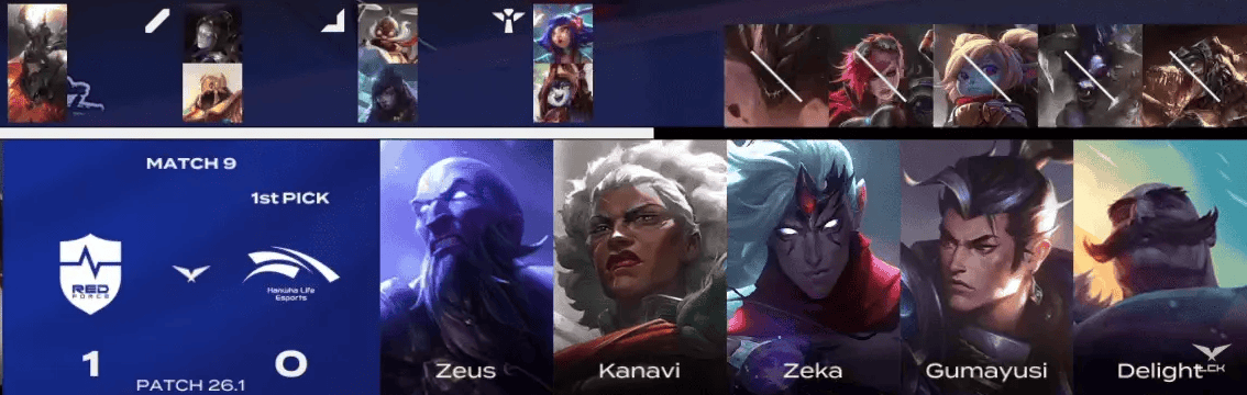 HLE选用:Zeus塞恩、Kanavi剑魔、Zeka沙皇、Gumayusi厄斐琉斯、Delight璐璐