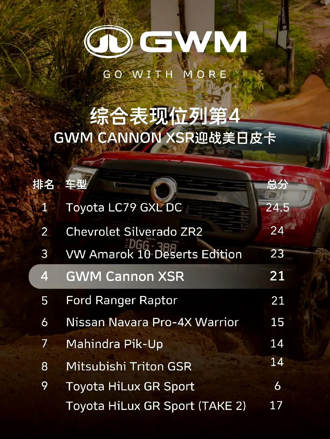 长城炮皮卡在澳洲与美日主流皮卡越野比拼,综合表现位列第4,仅次于丰田LC79、雪佛兰 Silverado 个大众 Amarok。超越三菱、日产、福特 Ranger Raptor、海拉克斯 GR 等多款热门车型。 长城汽车是本次澳大利亚越野赛中唯一参与的中国汽车品牌,如果比亚迪大名鼎鼎的鲨鱼皮卡去了,能不能霸榜冠军?