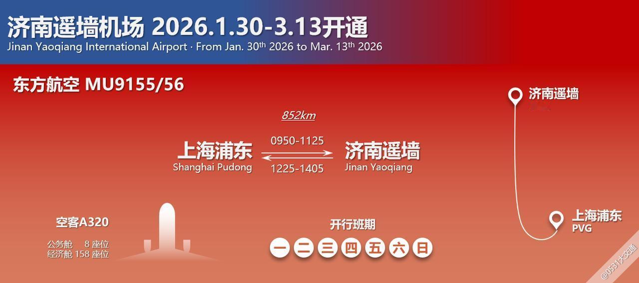 春运期间,东方航空调整济南出港航班运力。1.30-3.13日间,停飞上海浦东-济