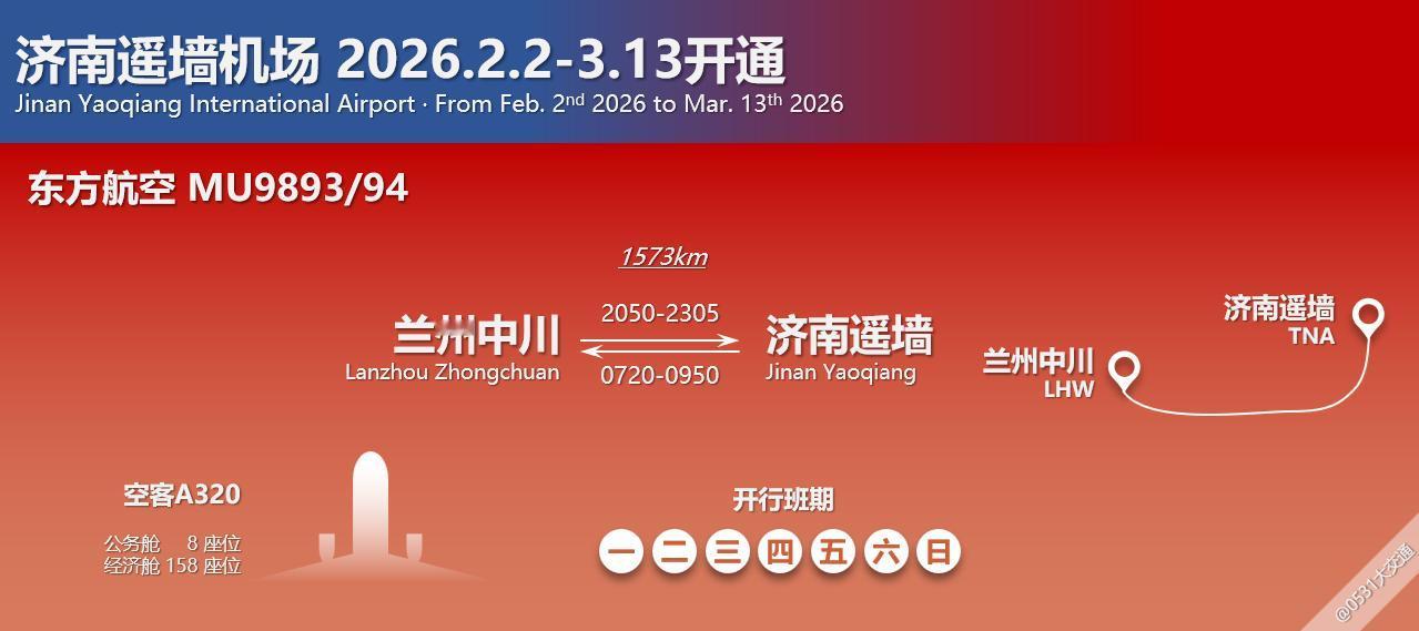 春运期间,东方航空调整济南出港航班运力。1.30-3.13日间,停飞上海浦东-济南-佳木斯/齐齐哈尔航线,同步济南-上海浦东间加开MU9155/56,相当于济南-浦东间运力不变,当然后期也可能继续加密济南-上海间的航线[无辜笑][无辜笑]。1.4-3.27日间,停飞济南-鄂尔多斯-西宁航线;同步,2.2-3.27日间加开MU6445/46济南遥墙-成都双流航线,济南晚出港早进港,2.2-3.13日间加开MU9893/94兰州中川-济南遥墙航线,济南早出港晚进港,新增航线均为A320执飞,每日一班,相当于兰州放一架到济南过夜,济南再放一架到成都过夜[吃瓜群众][吃瓜群众]。航线调整后春运期间在济南机场的通航机场仅剩15座,甚至已经被北部湾超过[奸笑][奸笑]
