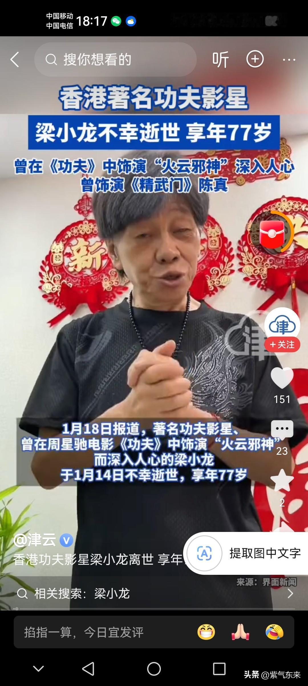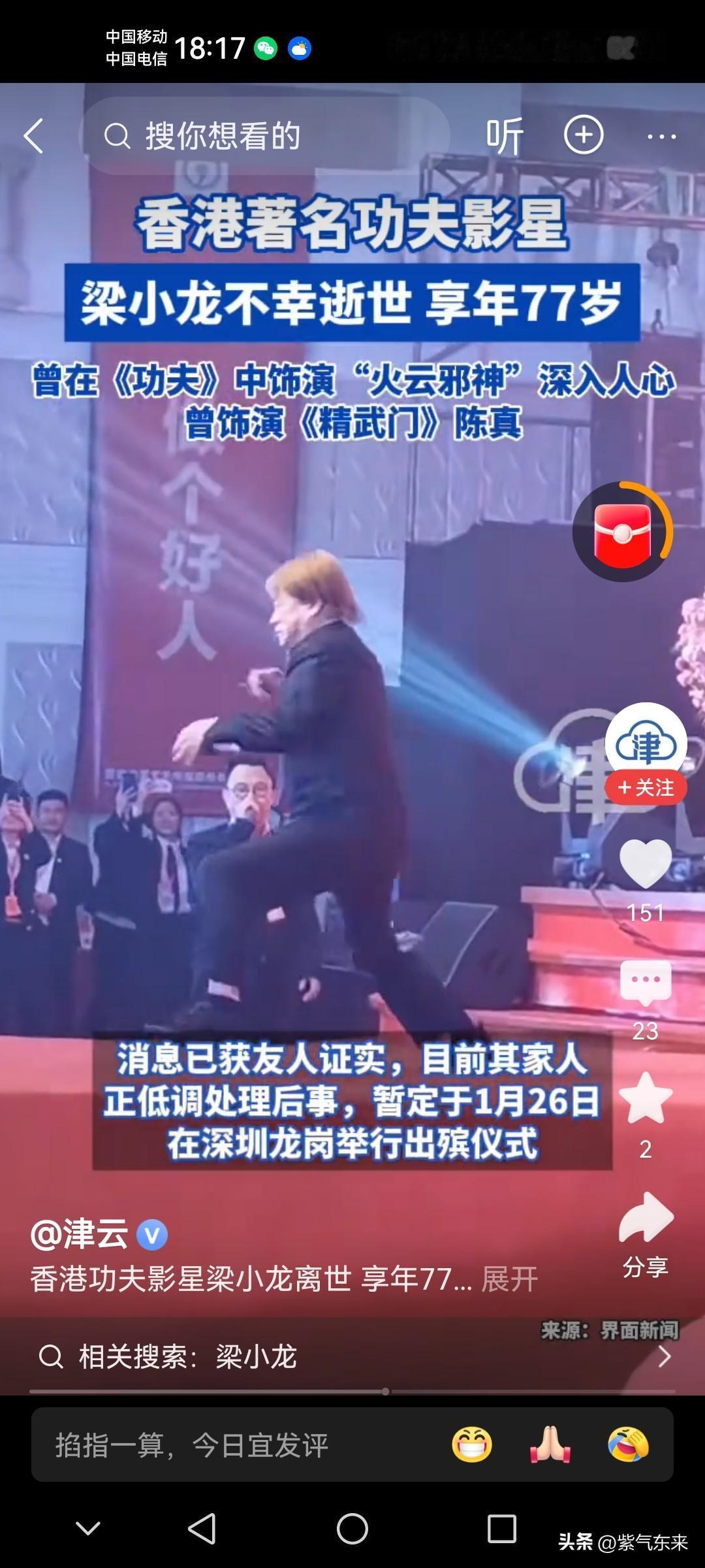 你敢相信吗 《精武门》的陈真走了! 带走了80后的青春和回忆! 一代人的回忆! 香港著名功夫影星梁小龙不幸逝世,享年77岁! 最经典的角色就是《精武门》饰演陈真,和《功夫》中饰演的火云邪神! 梁小龙遵从自然科学规律,生老病死! 这几年很多香港耳熟能详的明星都去世了,岁月催人老,谁都逃脱不了命运的安排! 每个人都有离开的那一天,无一例外,包括你我! 科技虽然可以延缓衰老和死亡,但最终都会被命运带走! 来也匆匆去也匆匆,都是一场梦!梁小龙身高 陈真武术名场面 热血陈真