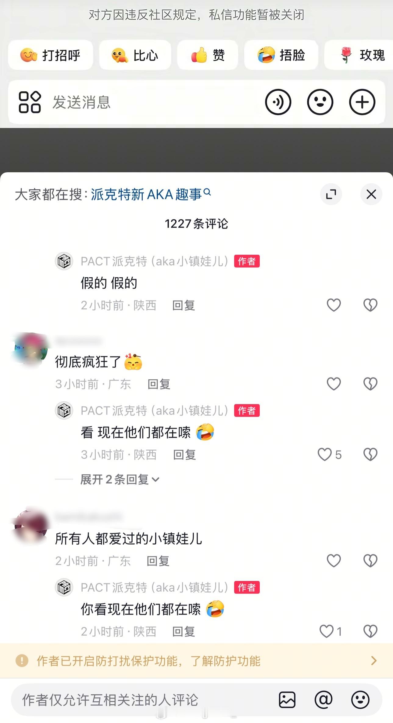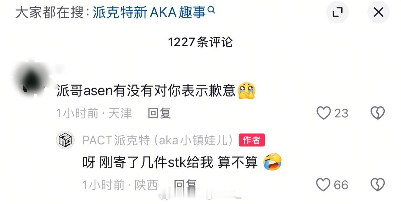 网友问Asen有没有对派克特表示歉意,派克特表示:“呀 刚刚寄了几件stk给我 算不算”今天晚上派克特继续在评论区狂玩🔒吊梗,然后关闭了评论区。派克特