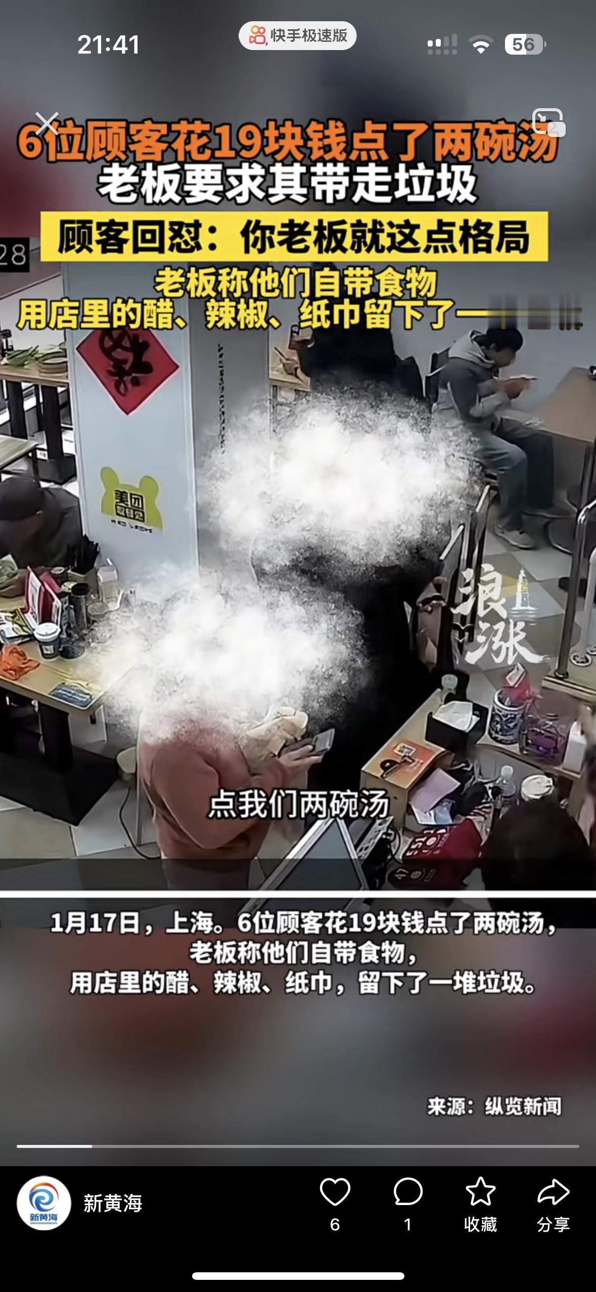真是贼喊捉贼,在上海7位顾客来到小饭店,点了2碗汤花了19元,然后拿出来自己带的食物一起吃,把桌子上的辣椒油,醋都加在自己带来的食物上,没有一点用在汤里 他们吃完后,留下了一地的垃圾和满桌子的卫生纸!老板要求他们把垃圾带走,却被他们回怼:老板就这点格局! 小店经营本来就难做,两碗汤占座7人坐了1个多小时,留下一堆垃圾还说老板没格局,这真是占尽便宜后还倒打一耙