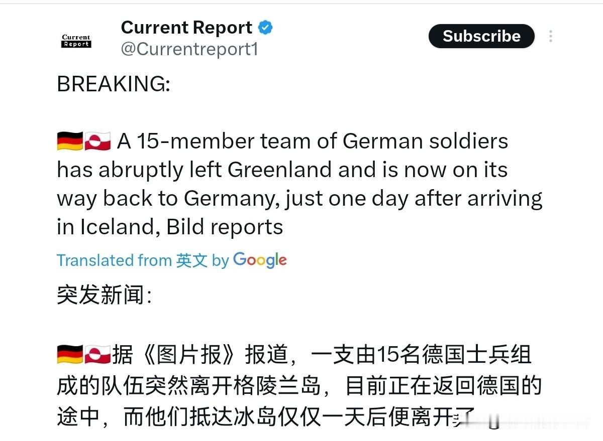 德国撤兵了,面对特朗普的压力,德国一天都没有坚持住!特朗普刚宣布要对欧洲八国加关税,不到24小时,德国就宣布撤军了!1月18日,根据德国图片报报道,一支由15名士兵组成的德国小分队在抵达冰岛仅一天后,便突然宣布撤离格陵兰岛,目前正启程返回德国。说实话,德国如此快宣布撤军,这真是让人咋舌。 随着德国宣布撤军,还驻扎的格陵兰岛的欧洲军队仅仅只剩下24人,分别是法国15人、瑞典3人、挪威2人、芬兰2人、英国1人、荷兰1人 。虽然德国方面没有解释撤军的原因,但是这样的撤出肯定与特朗普的加税有关。事情是明摆着的,特朗普对欧洲八国加税的直接原因就是这八国派兵到了格陵兰。此番,德国撤军,这只说明一点,那就是虽然德国想要保护格陵兰,但是德国根本没有底气跟美国硬碰硬。 大概德国也意识到跟美国硬干,德国必然会是吃亏的一方,因此先撤为妙。显然,德国这一撤,剩下的几个国家就非常尴尬了。如果特朗普不在对德加税,其它的几个国家撤还是不撤。如果不撤,那就等着被加税,如果撤,那就是说这几个国家对格陵兰的支持是纸糊的一般,不堪一击。面对如此不团结的欧洲,美国显然可以各个击破,搞分化瓦解了。