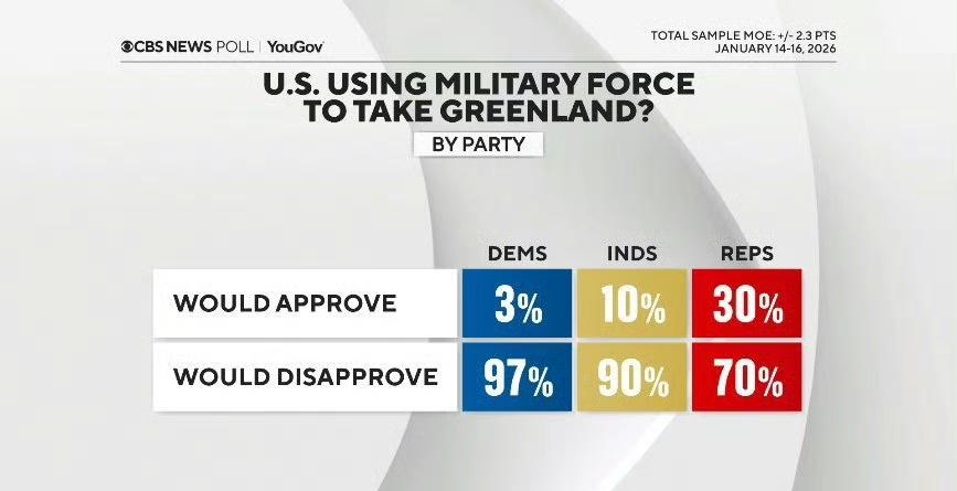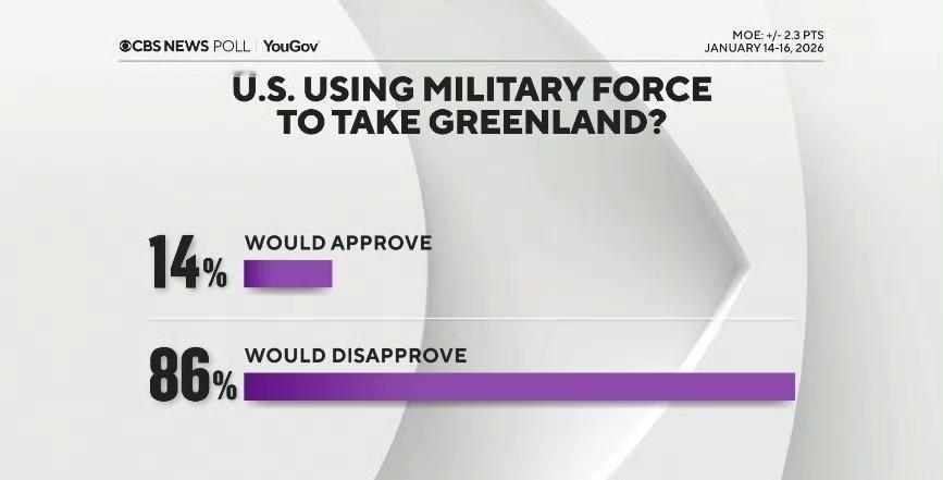 关于美国是否应以军事手段接管格陵兰岛的民调(来源:CBS News) 🇺🇸 86%的美国人表示: 👉 反对美国使用军事力量接管格陵兰岛。 在共和党选民中: 👉 30%的人表示支持美国使用军事力量接管格陵兰岛,70%反对。