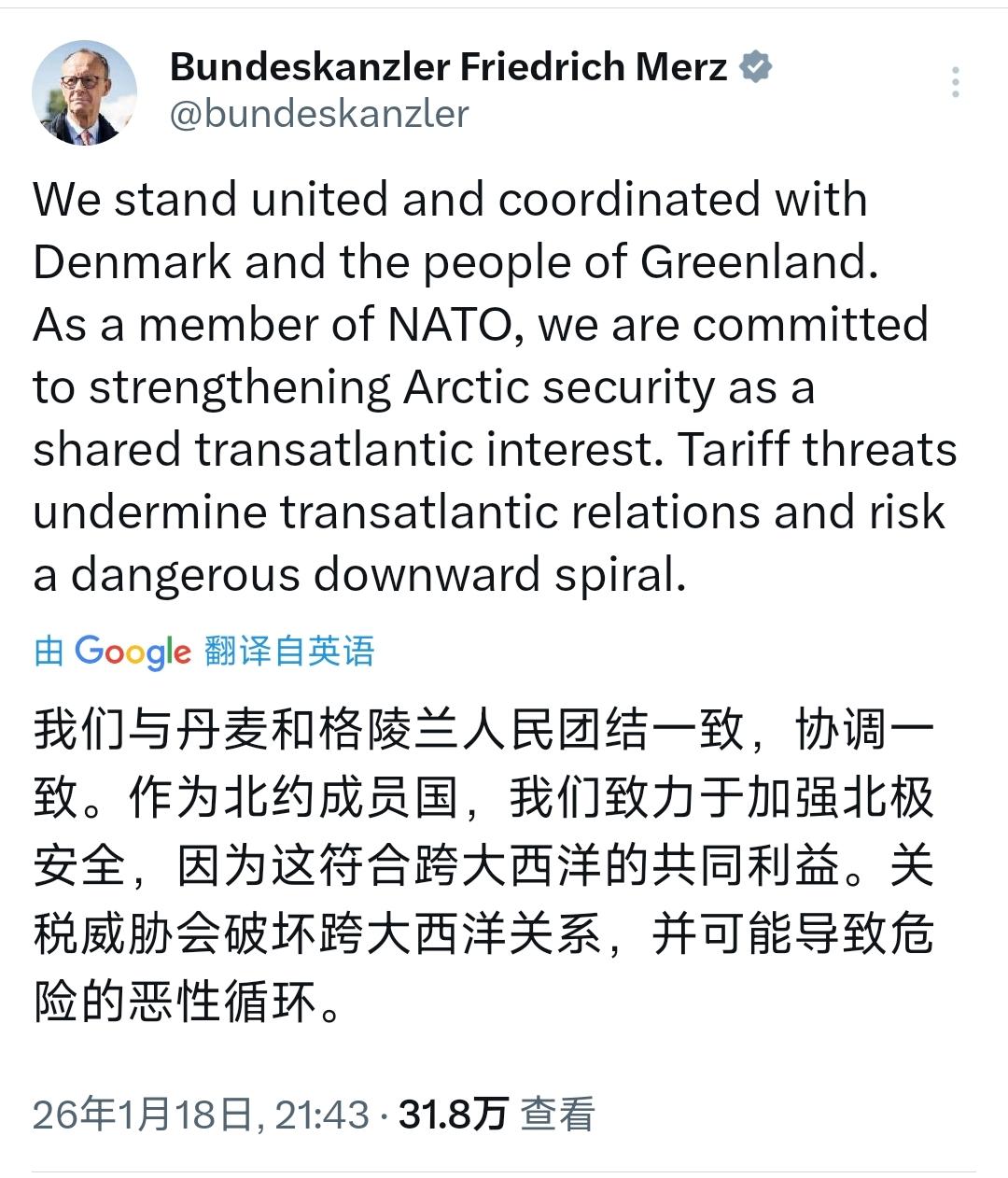 德国总理默茨昨晚(北京时间1月18日晚)写道:“我们与丹麦和格陵兰人民团结一致,协调一致。作为北约成员国,我们致力于加强北极安全,因为这符合跨大西洋的共同利益。关税威胁会破坏跨大西洋关系,并可能导致危险的恶性循环。” [机智]评几句;15名德军上岛44小时便紧急撤离,预定计划戛然而止却无半句明确解释,这场仓促的撤离恰是德国在跨大西洋关系中狼狈姿态的缩影。德国总理默茨的声明堪称“避重就轻”的典范,明明是特朗普政府以10%关税相逼、直言要“夺取格陵兰岛”,他却连美国和特朗普的名字都不敢点,只敢用“关税威胁”这种模糊表述虚与委蛇。一边想借北极部署彰显欧洲影响力,一边在美方强权面前秒怂撤军,这种既想刷存在感又不敢硬碰硬的矛盾操作,暴露了德国在安全上依赖美国、外交上缺乏底气的深层困境,所谓“跨大西洋共同利益”,终究成了不敢直面霸权的遮羞布。