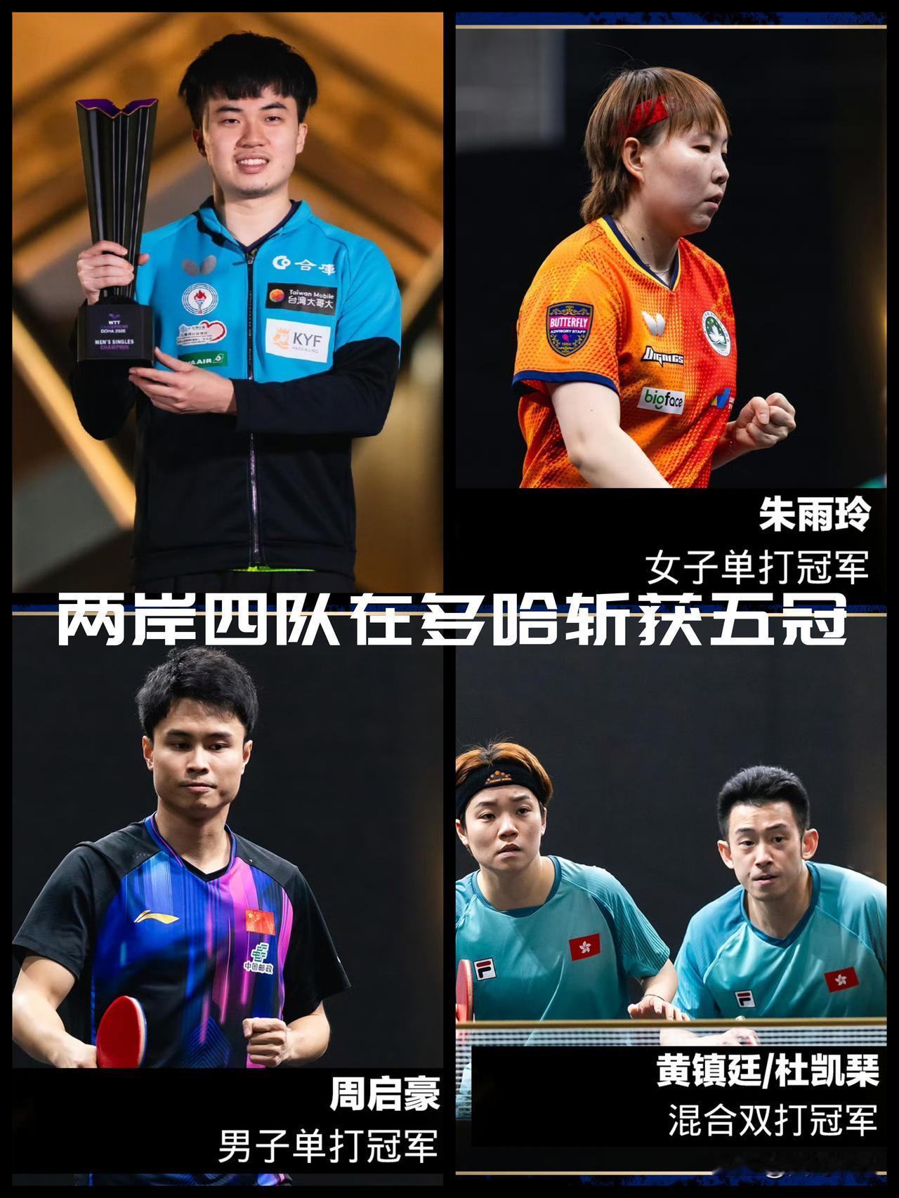 【两岸四队夺五冠!多哈赛季开局国乒有遗憾也有惊喜!】 WTT新赛季赶在春节前拉开大幕。 一上来就是高潮,多哈首届冠军赛,国乒发挥一般,但冠军都被中国球员斩获。 男单冠军:中国台北林昀儒; 女单冠军:中国澳门朱雨玲。 紧接着多哈球星挑战赛开打!林诗栋、蒯曼、梁靖崑、陈熠等球员连轴转。 最终,国乒斩获一冠两亚!女单未进四强是遗憾,男单包揽冠亚军是惊喜。 五项冠军分属中国队、中国澳门队、中国香港队、韩国队和日本队。