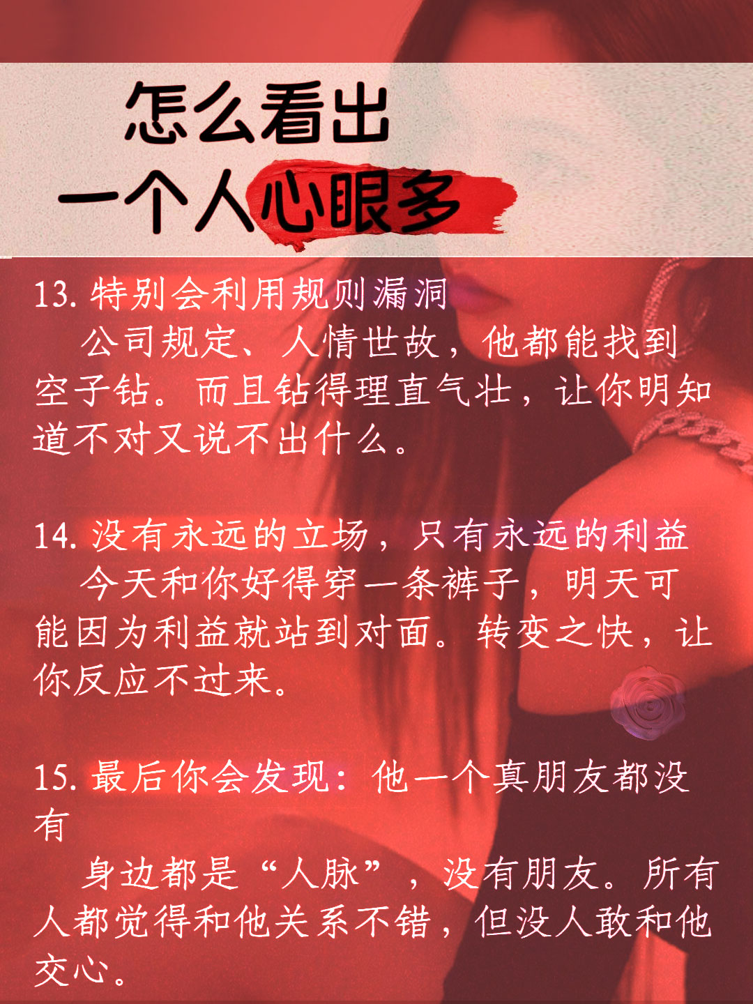 一眼识别“心眼多”的人,这15个信号藏不住 #怎么看出一个人心眼多? 与人相处最累的,莫过于碰到“心眼多”的人。他们表面圆滑周到,实则步步算计,稍不留意就可能被拿捏。其实这类人的特质很明显,这15个信号,对照看看你身边有没有👇