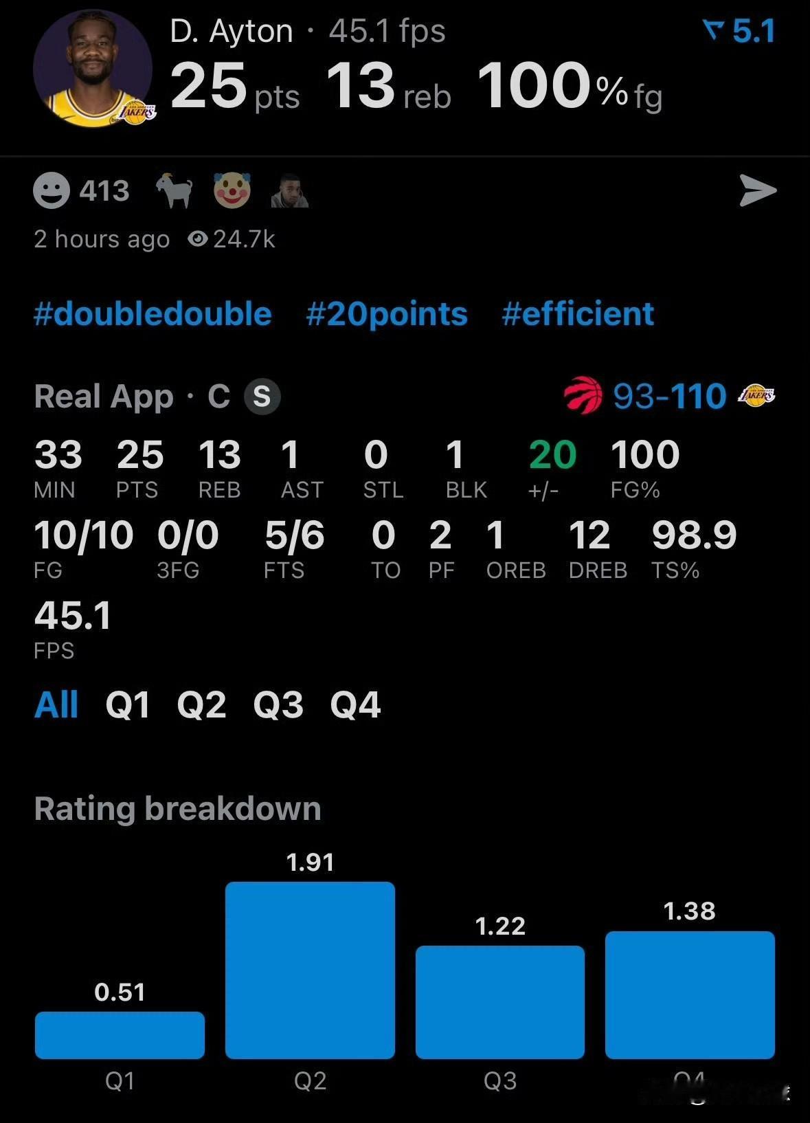 百分百先生—艾顿! 今天,背靠背作战的湖人队以110-93大胜猛龙队,结束了自己的两连败。本场比赛,表现最出色的不是东契奇和詹姆斯两大核心,而是主力中锋艾顿,他全场10投10中,以100%的运动战投篮命中率得到25分13篮板,这两项数据都是全队第一,正负值高达+20。 面对猛龙队的“长人阵”,艾顿强硬的统治了内线,带领球队拿下了比赛的胜利,毫无疑问,这是他加盟湖人队以来表现最为出色的一场比赛,让人大为震撼!