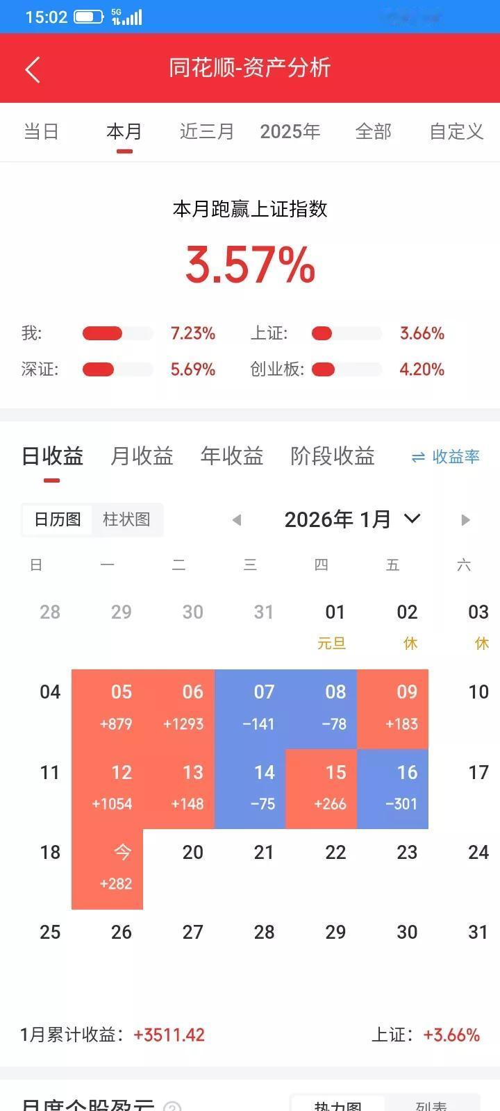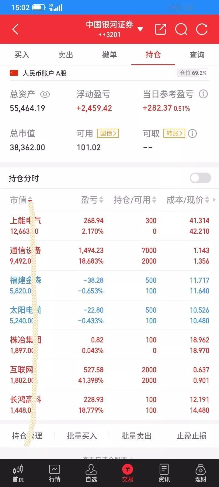 2026.01.19,今天上证指数继续反弹上涨,大部分股票都上涨,胆小了,踏空了,星期五很多都卖错了,我的交易系统和现在的行情不合适。还是按照计划做吧,踏空了也就调整思路,加大仓位。 今天早上看到太阳高开高走,感觉踏空了,马上委托10.10买入,但是没有成交就快速上涨,马上追高以10.26买入100股,并没有涨停,但是今天还是大涨,不符合我的交易计划,收盘前以10.49买入300股,不能恐高,加大仓位。 早上上能大幅低开,没有什么好怕的,也不符合我的交易计划,就修改一下吧,开盘轻仓尝试,集合竞价以39.51买入100股,下午上涨也没有追了,还是按照计划收盘再买入,贵一点也算了,确定性高一点,收盘以42.21买入200股,仓位加大。 株冶预估会收阳线,收盘前以18.96买入100股,还是还是买错了,收盘没有收阳线,今后还是等收盘再买。 长鸿收阴线,继续观望。 金森今天低开高走,收阳线,收盘前以11.63买入100股,收盘以11.64再买入300股。加大仓位。 互联网etf继续收阴线,继续保留底仓观望等待。 通信设备etf收阳线,收盘以1.356买入5000股,加大仓位,赌大一点。 今天上能误打误撞,没有按照交易系统做,还蒙对了,不然今天又是陪跑的一天,还好蒙对了,今天浮盈一点点,都是这只股票贡献的。 今天总市值3.83万元,总资产5.54万元,今天总体账户反弹回本282元。希望明天好运,延续今天上涨的趋势继续上涨吧。