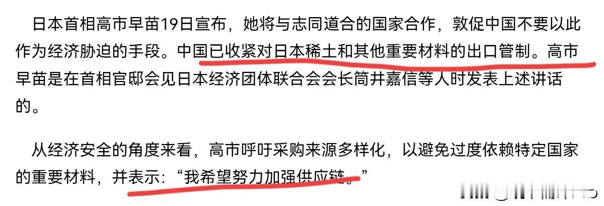 不会因为中国的压力而让步,高市早苗出来表态了!1月19日,日本首相高市早苗宣布,她将与志同道合的国家合作,敦促中国不要以此作为“经济胁迫”的手段。高市早苗称,中国已收紧对日本稀土和其他重要材料的出口管制。日本将会让采购来源多样化,以避免过度依赖特定国家的重要材料,我希望努力加强供应链。 很显然,从高市早苗的态度来看,日本的意思很清楚,那就是日本不会在我们的管制压力下让步,日本的应对之策,就是实现供应链的多元化。高市早苗一口咬定我们这是所谓的“经济胁迫”,这其实也说明日本不打算正视根本性问题,而选择跟我们硬扛。 当然,从我们的角度而言,日本如何看待我们的反制,这是日本自己的问题,我们要做的就是让日本明白,日本必须为其行为付出代价。再者,高市早苗撤不撤回其恶劣言论已经无关紧要,我们更在意的就是日本是不是会继续走军国主义道路。如果日本野心不改,我们恐怕还有后续手段,应对日本。