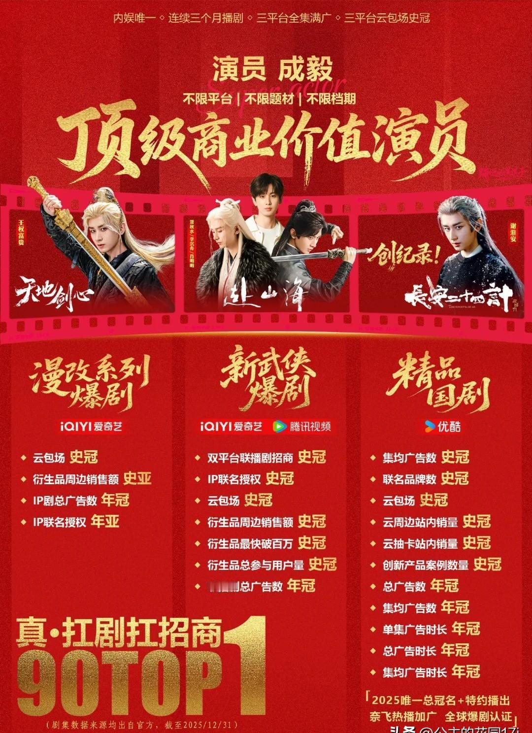成毅和欢瑞,这次竟然没撕? 说实话,这在娱乐圈真算个异类。 合约2026年1月18日自然终止。 不续约,无纠纷。 热搜第一,讨论度炸了。 为什么能这么体面? 说到底,是双方价值都到顶了。 欢瑞用《琉璃》把成毅捧成了一线。 成毅也用连续爆款,回馈了公司股价。 互相成就的阶段,已经完成。 但一个顶级演员的下半场,要的是什么? 是自主权。 你仔细看最近的动向: 接触古装大制作名导项目。 洽谈现代都市剧。 多家一线公司抛橄榄枝。 他缺的不是戏约。 是“自己说了算”的创作空间。 所以成立个人工作室,几乎是必然选择。 自己挑剧本,自己定团队,自己掌控节奏。 参考杨紫、赵丽颖的路子,这是顶级演员进化到下一阶段的标配。 粉丝为什么狂欢? 她们等的就是这一天。 从“欢瑞打工人”到“成毅老板”。 这意味着一件事:他未来接的每一个角色,都纯粹是因为“他想演”,而不是“他该演”。 一个演员的黄金期,拼到最后就是话语权。 合约是绑不住凤凰的,天空才是。 真正的体面,不是好聚好散,而是散后各自攀登,在更高处重逢。 你觉得,单飞后的成毅,是会延续“古装男神”的绝对优势,还是彻底转型,挑战所有人意想不到的题材? 👇评论区,等你预言。