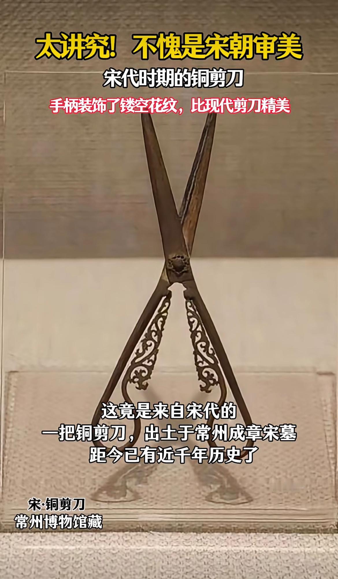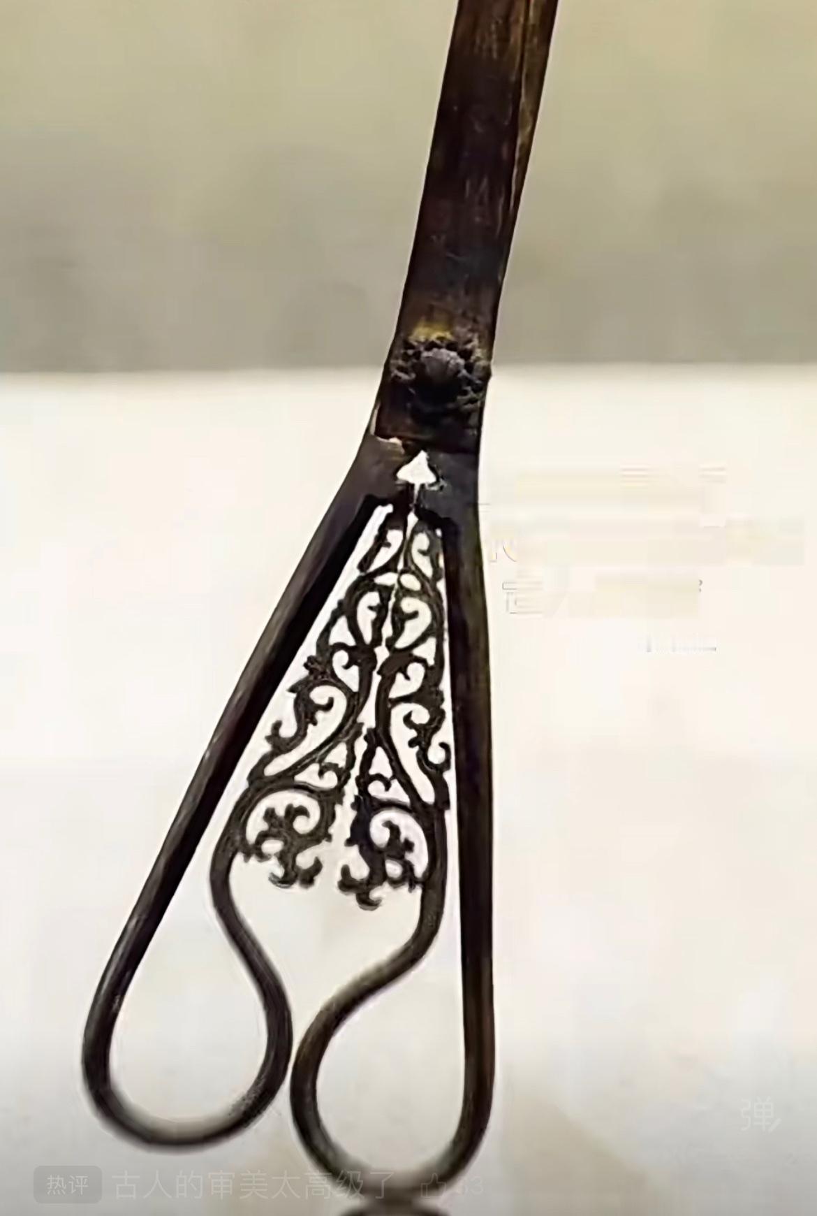 宋代的铜剪刀,手柄装饰了镂空花纹,比现代剪刀还精美,宋代的审美就是不一般哈。 宋代 审美