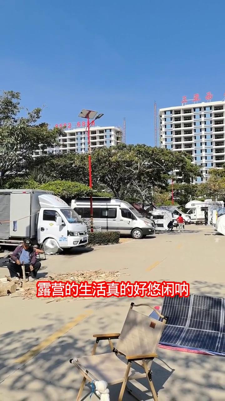 今天是1月9日,现在是中午时分,这里是海南乐东县九所的乐东县的九所镇,也是乐东高铁站附近的一个营车露营地。 在这里露营的来自全国各地的候鸟们、旅居者们,这里在喝椰子,这边在下象棋,帐篷里搭的吊床。这里太阳能板正在发电,露营地有男洗浴间、洗手间还有女洗浴间。那里劈柴正准备做饭,这里做饭的各种餐具,这里还有出售二手炉子的。 露营的生活真的好悠闲,这里艳阳高照,晴空万里。现在的外温只有十八九度,小风清凉凉的,基本上没有风,这种感觉确实很舒适。
