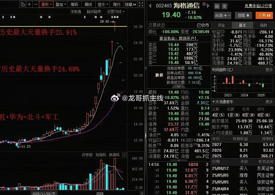 雪上加霜!海格通信3个一字跌停,盘后公告,2025年业绩预计亏损。今天收盘第三个一字跌停,跌停板上50.9亿封单。这太恐怖了,趁你病要你命!虽然这些妖股炒作跟业绩没什么关系,不但没关系,游资爆炒,还喜欢找业绩差的,涨潮期,拉升的时候忽视一切利空,但现在是退潮,放大利空,忽视利好。按照目前这种封单,肯定是有爆仓的了,那么再来两个跌停,直接腰斩。这一把,跟直接踩雷一个退市的杀伤力一样。这种巨大的杀伤力,会向其它高标传到,未来量化,游资,JG会更严。