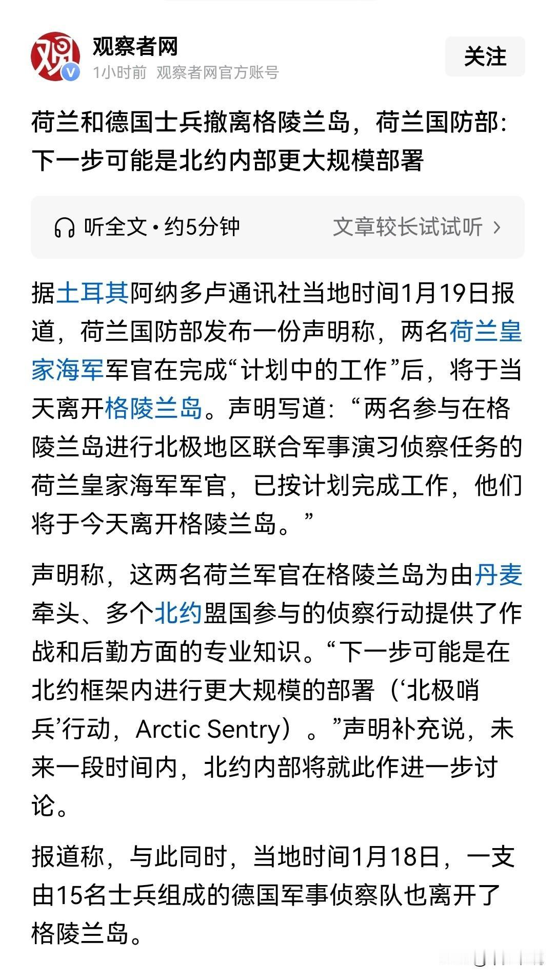 北约根本不可能为格陵兰做主 荷兰和德国从格陵兰岛撤兵之后都发布了声明,声明称已经完成了既定任务,并且等待北约的下一步指示。 然而北约根本不会为了格陵兰岛个丹麦与美国为敌,而且北约一直以来都是由美国所主导的。