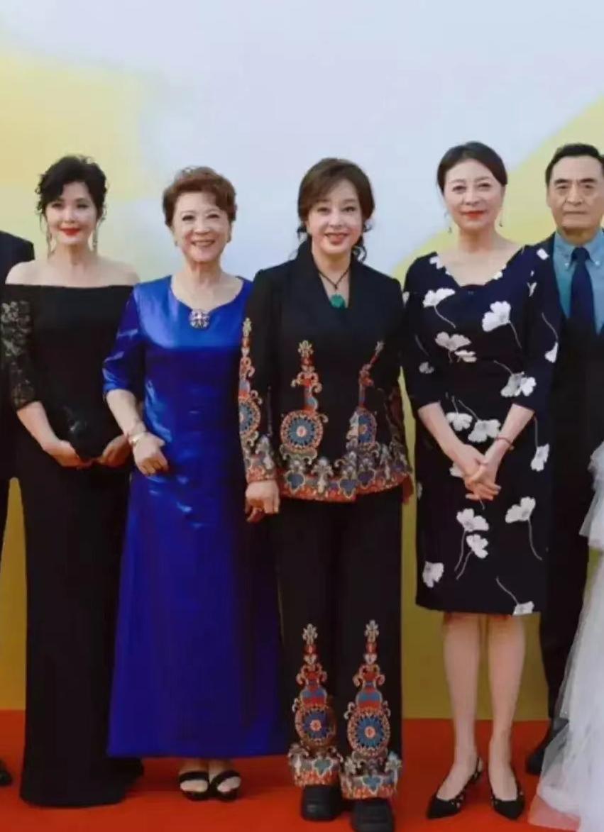 几位老戏骨同框:身着一袭宝蓝色缎面长裙的王馥荔盘发精致,笑容甜美,气质高雅;穿着印花连衣裙的岳红身材高挑,浅淡春山,温婉如莲哈! 一身刺绣套装出镜的刘晓庆皮肤白皙,目光沉和,背微驼,笑略僵;那位修项秀颈、穿着一字肩黑裙的美女与西装革履的男士是谁?