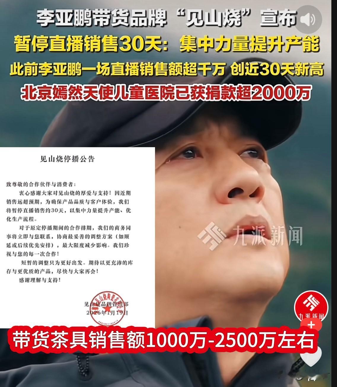 好消息,李亚鹏苦尽甘来,直播间带货茶具品牌“见山烧”销量突破十万大关,大约为10万至25万单之间。 库存见底,直播间仿佛直接干烧了CPU,“见山烧”品牌方紧急发布停播公告。停播时间为30天。 李亚鹏带货销售额为1000万至2500万元之间。 另外,嫣然天使儿童医院获赠超2000万元。